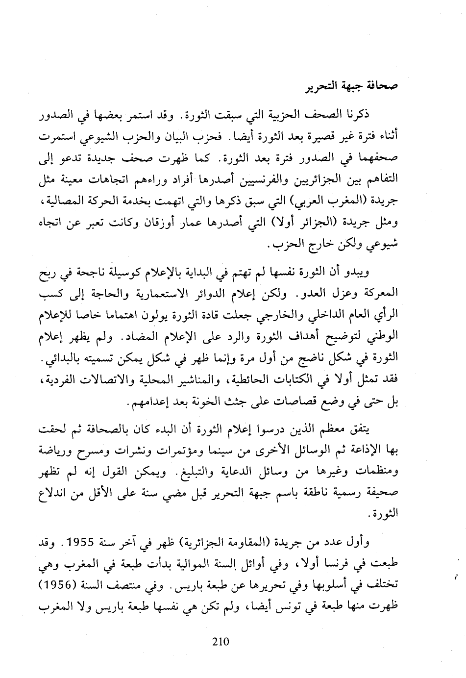 يتفق معظم الذين درسوا إعلام الثورة أن البدء كان بالصحافة ثم لحقت بها الإذاعة ثم الوسائل الأخرى من سينما ومؤتمرات ونشرات ومسرح ورياضة ومنظمات وغيرها من وسائل الدعاية والتبليغ، ويمكن القول إنه لم تظهر صحيفة رسمية ناطقة باسم جبهة التحرير قبل مضي سنة على الأقل من اندلاع الثورة.