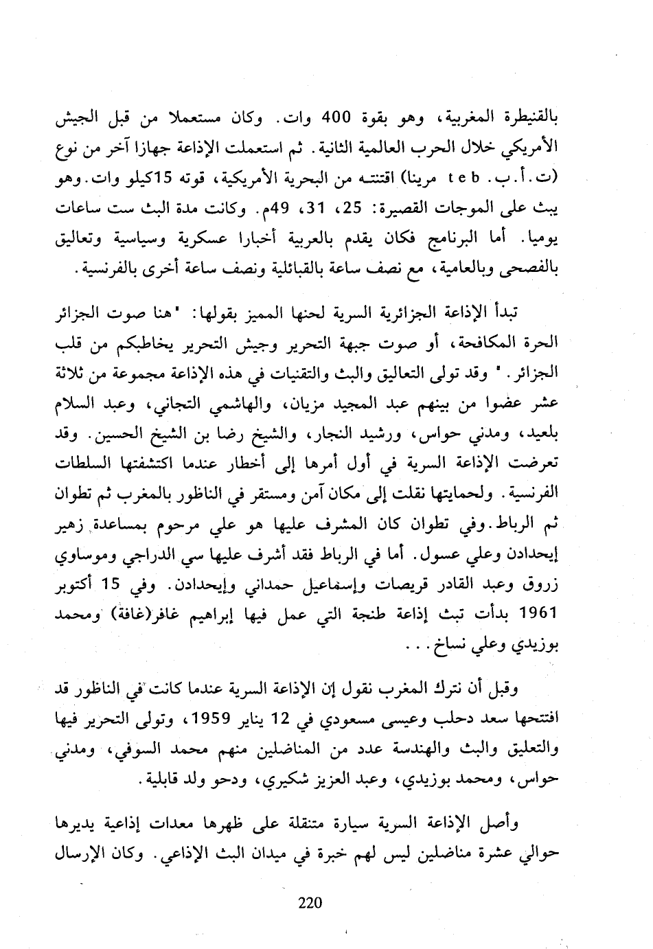 وقبل أن نترك المغرب نقول إن الإذاعة السرية عندما كانت في الناظور قد افتتحها سعد دحلب وعيسى مسعودي في 12 يناير 1959، وتولى التحرير فيها والتعليق والبث والهندسة عدد من المناضلين منهم محمد السوفي، ومدني حواس، ومحمد بوزيدي، وعبد العزيز شكيري، ودحو ولد قابلية.