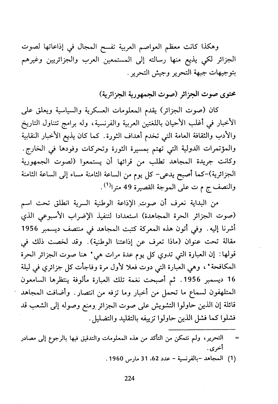 وهكذا كانت معظم العواصم العربية تفسح المجال في إذاعاتها لصوت الجزائر لكي يذيع منها رسالته إلى المستمعين العرب والجزائريين وغيرهم بتوجيهات جبهة التحرير وجيش التحرير.