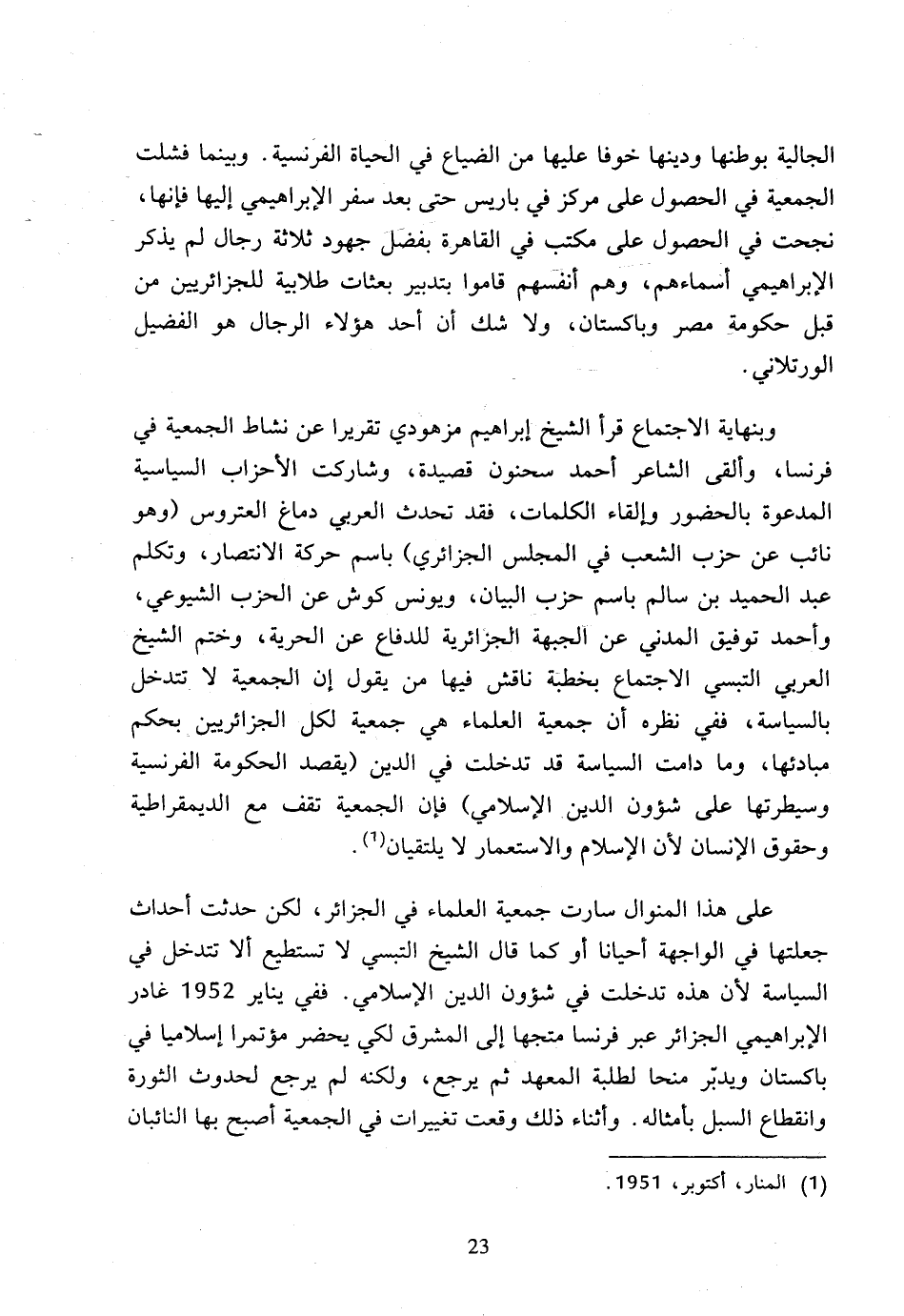 على هذا المنوال سارت جمعية العلماء في الجزائر، لكن حدثت أحداث جعلتها في الواجهة أحيانا أو كما قال الشيخ التبسي لا تستطيع ألا تدخل في السياسة لأن هذه تدخلت في شؤون الدين الإسلامي، ففي يناير 1952 غادر الإبراهيمي الجزائر عبر فرنسا متجها إلى المشرق لكي يحضر مؤتمرا إسلاميا في باكستان ويدبر منحا لطلبة المعهد ثم يرجع، ولكنه لم يرجع لحدوث الثورة وانقطاع السبل بأمثاله، وأثناء ذلك وقعت تغييرات في الجمعية أصبح بها النائبان