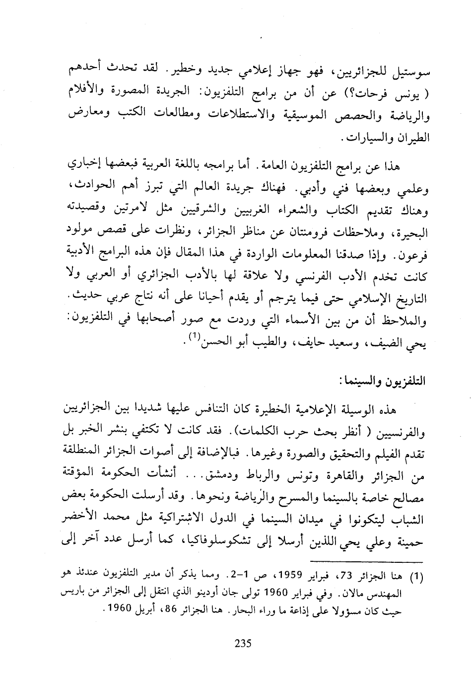 (1) هنا الجزائر 73، فبراير 1959، ص 1 - 2، ومما يذكر أن مدير التلفزيون عندئذ هو المهندس مالان، وفي فبراير 1960 تولى جان أودينو الذي انتقل إلى الجزائر من باريس حيث كان مسؤولا على إذاعة ما وراء البحار، هنا الجزائر 86، أبريل 1960.
