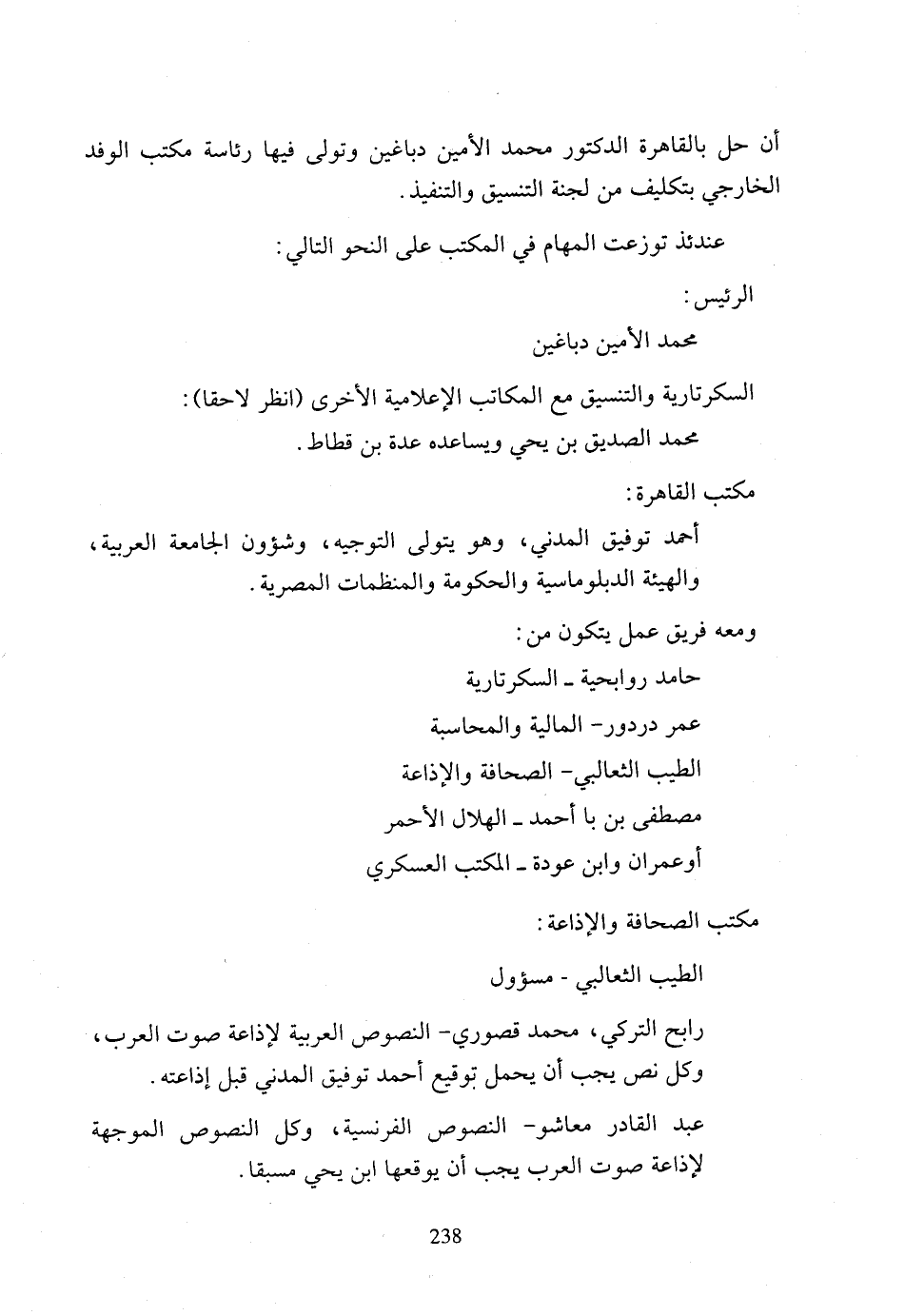 أحمد توفيق المدني، وهو يتولى التوجيه، وشؤون الجامعة العربية. والهيئة الدبلوماسية والحكومة والمنظمات المصرية.