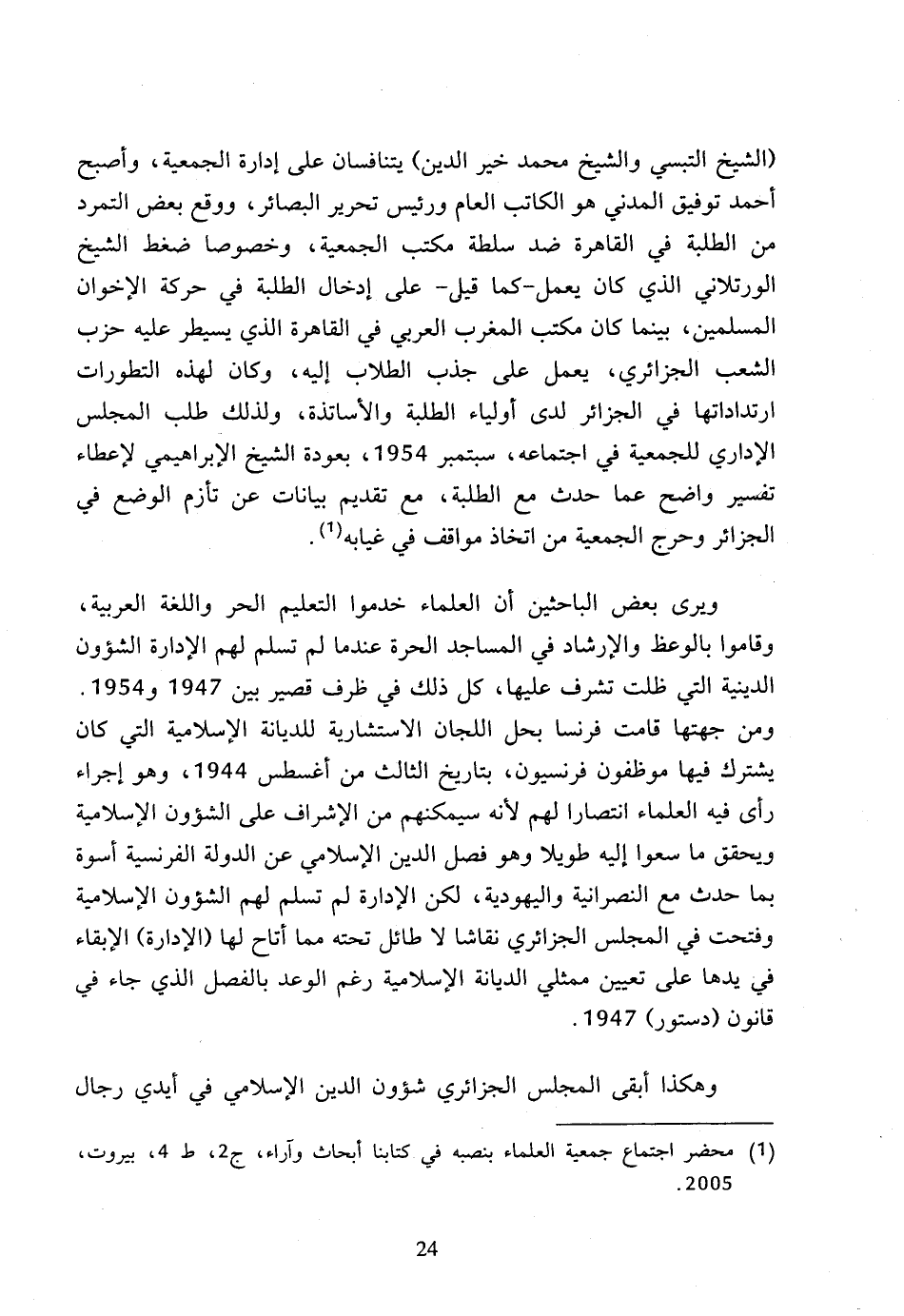 (الشيخ التبسي والشيخ محمد خير الدين) يتنافسان على إدارة الجمعية، وأصبح أحمد توفيق المدني هو الكاتب العام ورئيس تحرير البصائر، ووقع بعض التمرد من الطلبة في القاهرة ضد سلطة مكتب الجمعية، وخصوصا ضغط الشيخ الورتلاني الذي كان يعمل - كما قيل - على إدخال الطلبة في حركة الإخوان المسلمين، بينما كان مكتب المغرب العربي في القاهرة الذي يسيطر عليه حزب الشعب الجزائري، يعمل على جذب الطلاب إليه، وكان لهذه التطورات ارتداداتها في الجزائر لدى أولياء الطلبة والأساتذة، ولذلك طلب المجلس الإداري للجمعية في اجتماعه، سبتمبر 1954، بعودة الشيخ الإبراهيمي لإعطاء تفسير واضح عما حدث مع الطلبة، مع تقديم بيانات عن تأزم الوضع في الجزائر وحرج الجمعية من اتخاذ مواقف في غيابه (1).