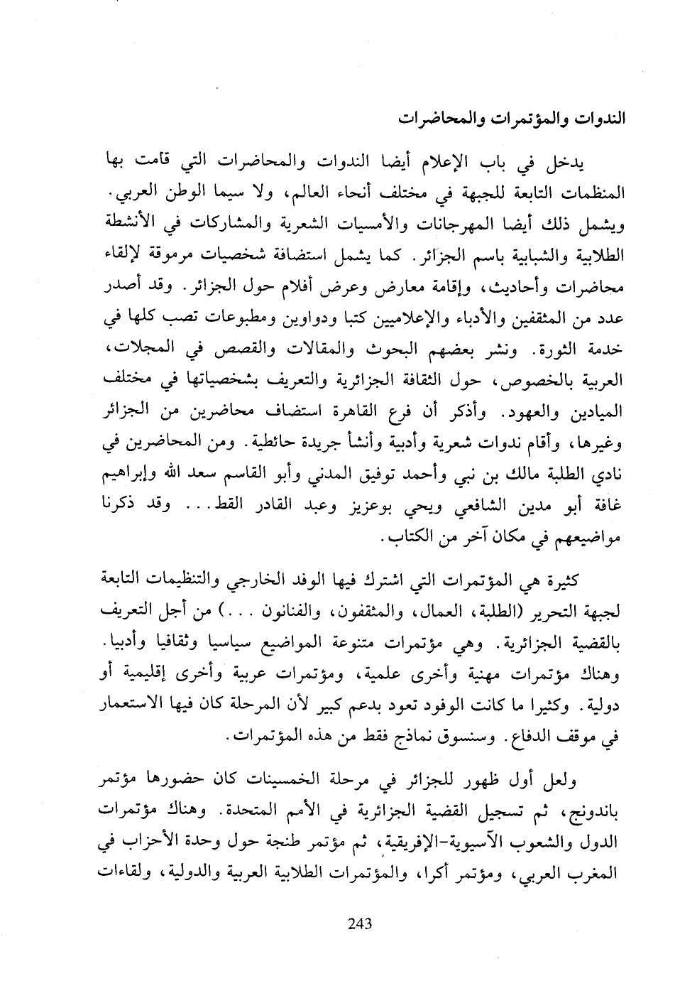 يدخل في باب الإعلام أيضا الندوات والمحاضرات التي قامت بها المنظمات التابعة للجبهة في مختلف أنحاء العالم، ولا سيما الوطن العربي، ويشمل ذلك أيضا المهرجانات والأمسيات الشعرية والمشاركات في الأنشطة الطلابية والشبابية باسم الجزائر، كما يشمل استضافه شخصيات مرموقة لإلقاء محاضرات وأحاديث، وإقامة معارض وعرض أفلام حول الجزائر، وقد أصدر عدد من المثقفين والأدباء والإعلاميين كتبا ودواوين ومطبوعات تصب كلها في خدمة الثورة، ونشر بعضهم البحوث والمقالات والقصص في المجلات، العربية بالخصوص، حول الثقافة الجزائرية والتعريف بشخصياتها في مختلف الميادين والعهود، وأذكر أن فرع القاهرة استضاف محاضرين من الجزائر وغيرها، وأقام ندوات شعرية وأدبية وأنشأ جريدة حائطية، ومن المحاضرين في نادي الطلبة مالك بن نبي وأحمد توفيق المدني وأبو القاسم سعد الله وإبراهيم غافة أبو مدين الشافعي ويحيى بوعزيز وعبد القادر القط ... وقد ذكرنا مواضيعهم في مكان آخر من الكتاب.