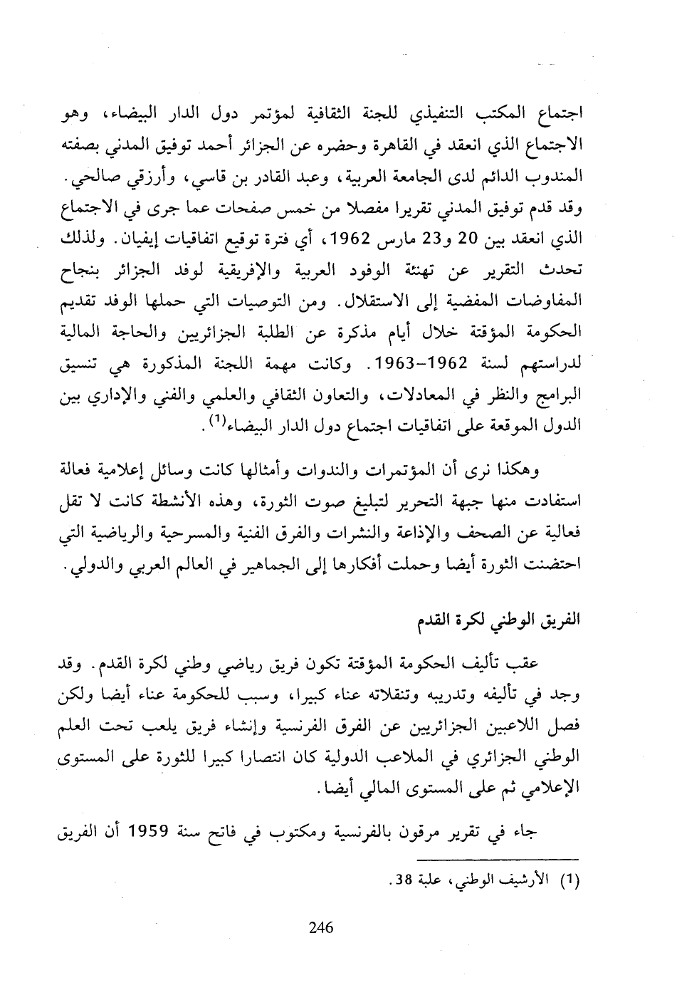 اجتماع المكتب التنفيذي للجنة الثقافية لمؤتمر دول الدار البيضاء، وهو الاجتماع الذي انعقد في القاهرة وحضره عن الجزائر أحمد توفيق المدني بصفته المندوب الدائم لدى الجامعة العربية، وعبد القادر بن قاسي، وأرزقي صالحي، وقد قدم توفيق المدني تقريرا مفصلا من خمس صفحات عما جرى في الاجتماع الذي انعقد بين 20 و 23 مارس 1962، أي فترة توقيع اتفاقيات إيفيان، ولذلك تحدث التقرير عن تهنئة الوفود العربية والافريقية لوفد الجزائر بنجاح المفاوضات المفضية إلى الاستقلال، ومن التوصيات التي حملها الوفد تقديم الحكومة المؤقتة خلال أيام مذكرة عن الطلبة الجزائريين والحاجة المالية لدراستهم لسنة 1962 - 1963، وكانت مهمة اللجنة المذكورة هي تنسيق البرامج والنظر في المعادلات، والتعاون الثقافي والعلمي والفني والإداري بين الدول الموقعة على اتفاقيات اجتماع دول الدار البيضاء (1).