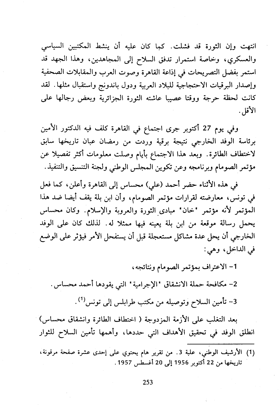 (1) الأرشيف الوطني، علبة 3، من تقرير هام يحتوي على إحدى عشرة صفحة مرقونة، تاريخها من 22 أكتوبر 1956 إلى 20 أغسطس 1957.