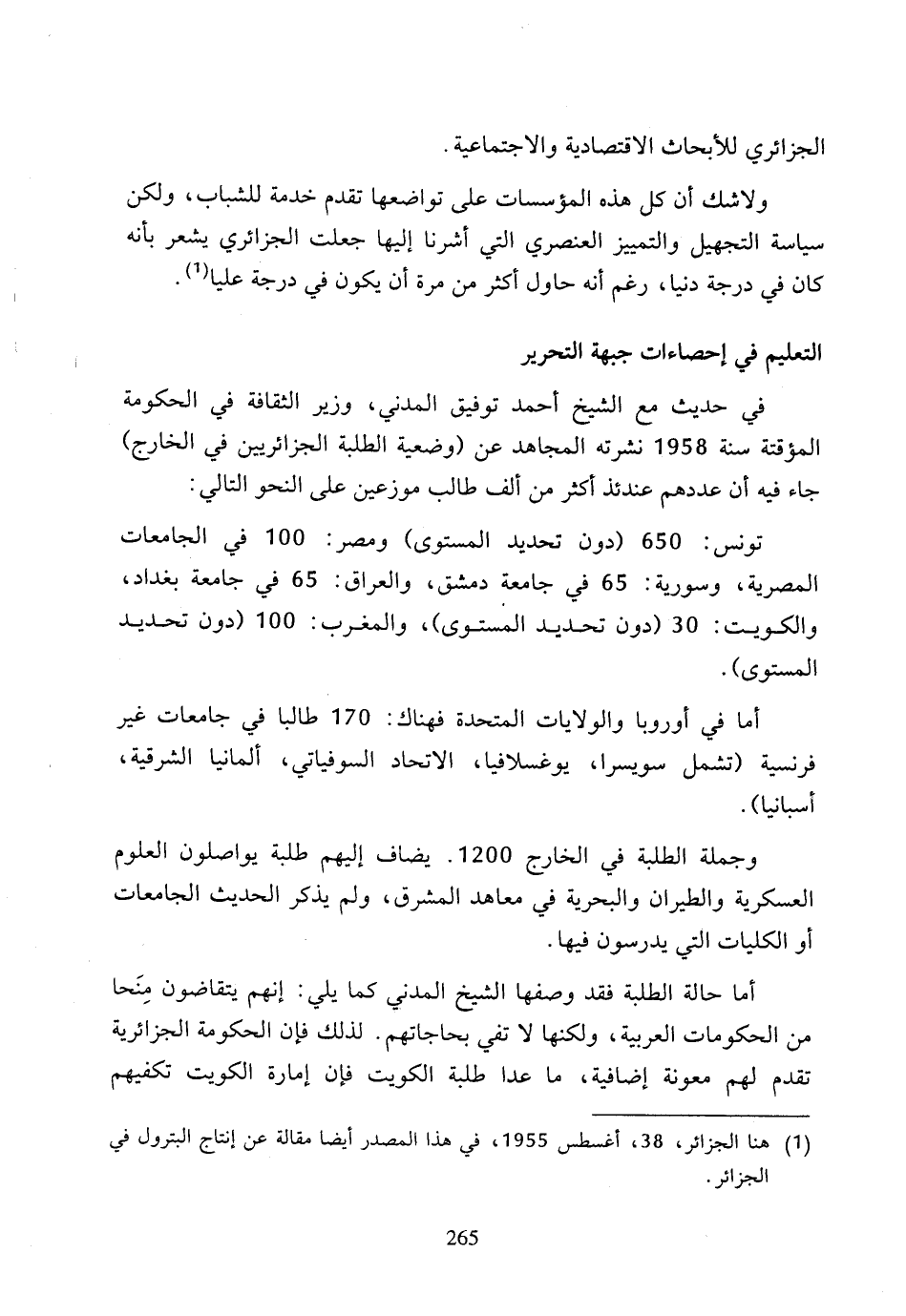 في حديث مع الشيخ أحمد توفيق المدني، وزير الثقافة في الحكومة المؤقتة سنة 1958 نشرته المجاهد عن (وضعية الطلبة الجزائريين في الخارج) جاء فيه أن عددهم عندئذ أكثر من ألف طالب موزعين على النحو التالي: