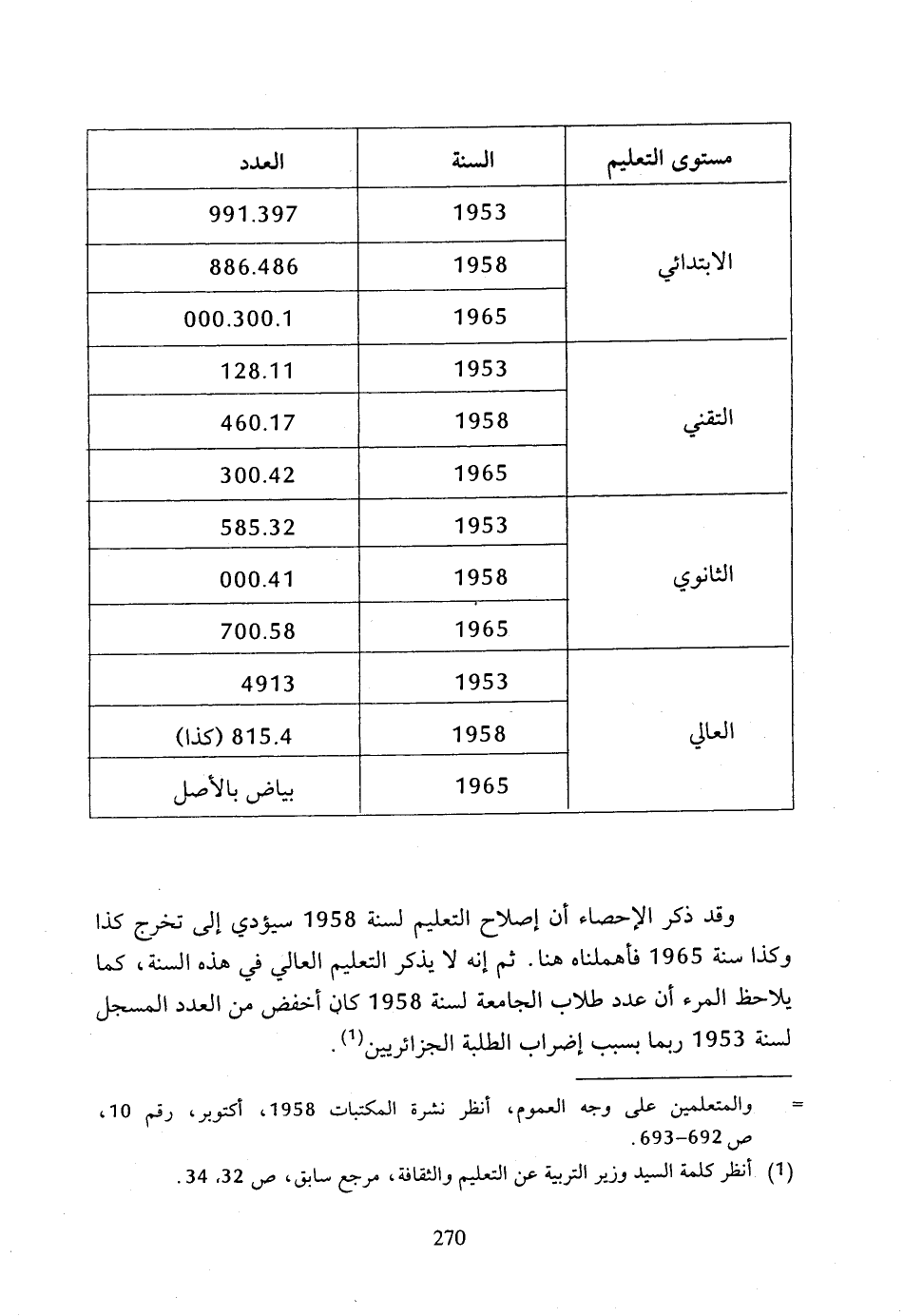 وقد ذكر الإحصاء أن إصلاح التعليم لسنة 1958 سيؤدي إلى تخرج كذا وكذا سنة 1965 فأهملناه هنا، ثم إنه لا يذكر التعليم العالي في هذه السنة، كما يلاحظ المرء أن عدد طلاب الجامعة لسنة 1958 كان أخفض من العدد المسجل لسنة 1953 ربما بسبب إضراب الطلبة الجزائريين (1).
