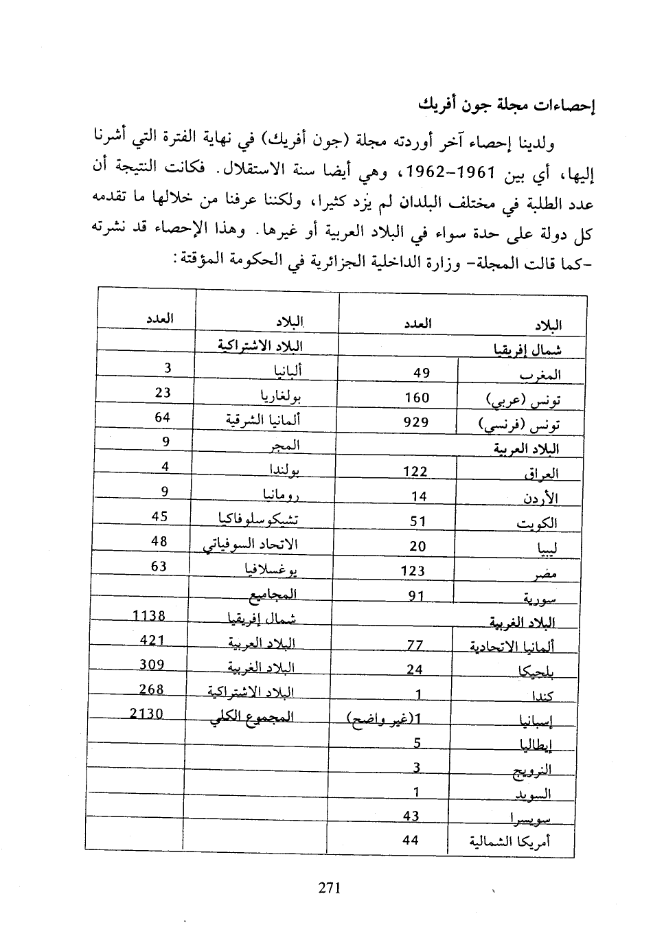 ولدينا إحصاء آخر أوردته مجلة (جوف أفريك) في نهاية الفترة التي أشرنا إليها، أي بين 1961 - 1962، وهي أيضا سنة الاستقلال، فكانت النتيجة أن عدد الطلبة في مختلف البلدان لم يزد كثيرا، ولكننا عرفنا من خلالها ما تقدمه كل دولة على حدة سواء في البلاد العربية أو غيرها، وهذا الإحصاء قد نشرته - كما قالت المجلة - وزارة الداخلية الجزائرية في الحكومة المؤقتة: