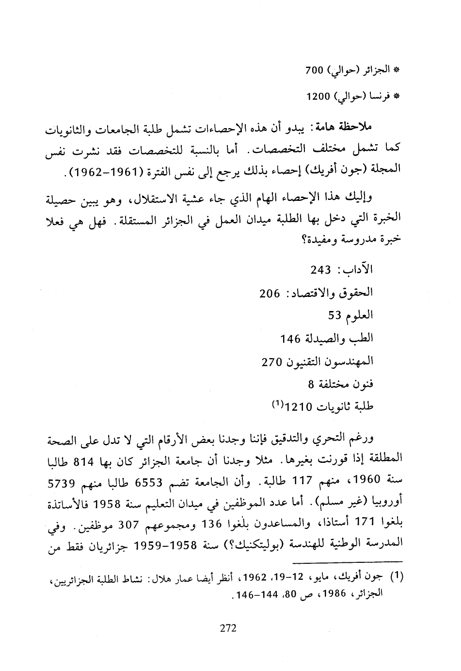 (1) جون أفريك، مايو، 12 - 19، 1962، أنظر أيضا عمار هلال: نشاط الطلبة الجزائريين، الجزائر، 1986، ص 80, 144 - 146.
