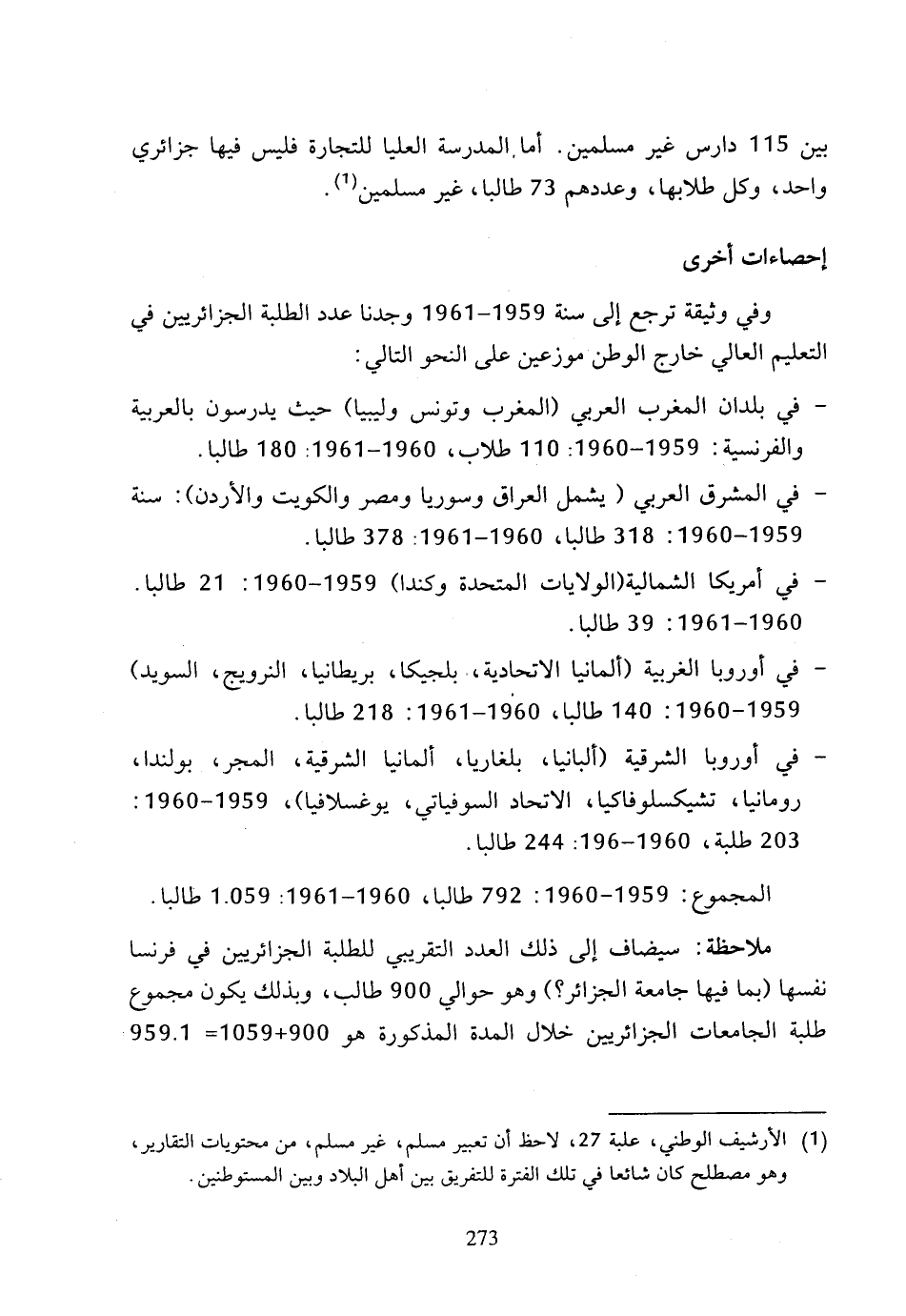 ملاحظة: سيضاف إلى ذلك العدد التقريبي للطلبة الجزائريين في فرنسا نفسها (بما فيها جامعة الجزائر؟) وهو حوالي 900 طالب، وبذلك يكون مجموع طلبة الجامعات الجزائريين خلال المدة المذكورة هو 1059، 900 = 959، 1