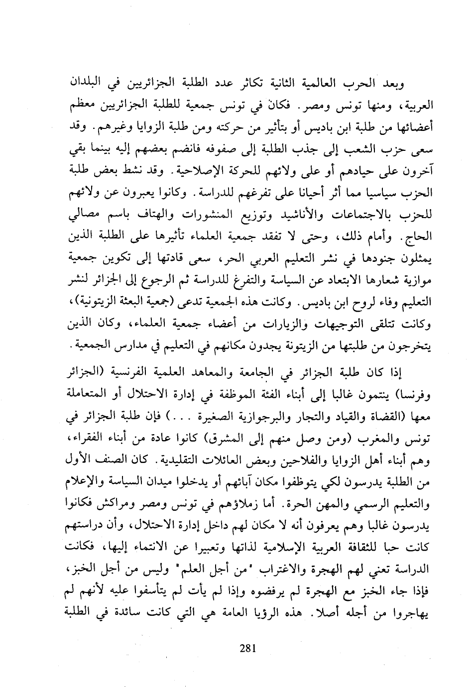 إذا كان طلبة الجزائر في الجامعة والمعاهد العلمية الفرنسية (الجزائر وفرنسا) ينتمون غالبا إلى أبناء الفئة الموظفة في إدارة الاحتلال أو المتعاملة معها (القضاة والقياد والتجار والبرجوازية الصغيرة ...) فإن طلبة الجزائر في تونس والمغرب (ومن وصل منهم إلى المشرق) كانوا عادة من أبناء الفقراء، وهم أبناء أهل الزوايا والفلاحين وبعض العائلات التقليدية، كان الصنف الأول من الطلبة يدرسون لكي يتوظفوا مكان آبائهم أو يدخلوا ميدان السياسة والإعلام والتعليم الرسمي والمهن الحرة، أما زملاؤهم في تونس ومصر ومراكش فكانوا يدرسون غالبا وهم يعرفون أنه لا مكان لهم داخل إدارة الاحتلال، وأن دراستهم كانت حبا للثقافة العربية الإسلامية لذاتها وتعبيرا عن الانتماء إليها، فكانت
