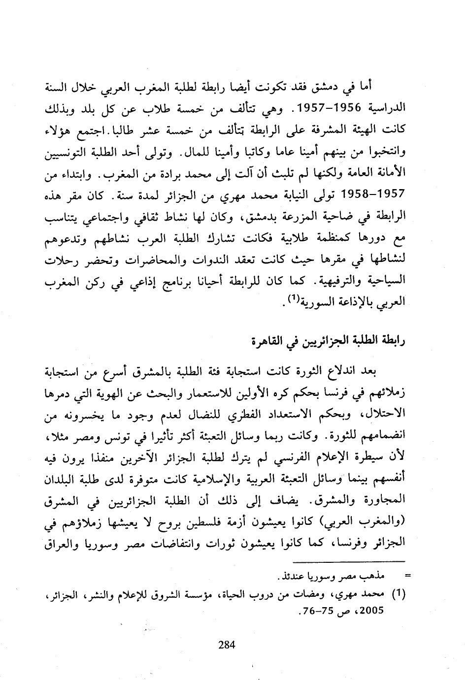 (1) محمد مهري، ومضات من دروب الحياة، مؤسسة الشروق للإعلام والنشر، الجزائر، 2005، ص 75 - 76.
