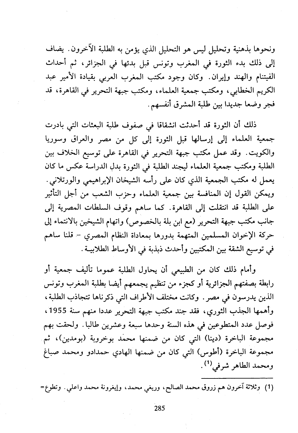 ونحوها بذهنية وتحليل ليس هو التحليل الذي يؤمن به الطلبة الآخرون، يضاف إلى ذلك بدء الثورة في المغرب وتونس قبل بدئها في الجزائر، ثم أحداث الفيتنام والهند وإيران، وكان وجود مكتب المغرب العربي بقيادة الأمير عبد الكريم الخطابي، ومكتب جمعية العلماء، ومكتب جبهة التحرير في القاهرة، قد فجر وضعا جديدا بين طلبة المشرق أنفسهم. ذلك ان الثورة قد أحدثت انشقاقا في صفوف طلبة البعثات التي بادرت جمعية العلماء إلى إرسالها قبل الثورة إلى كل من مصر والعراق وسوريا والكويت، وقد عمل مكتب جبهة التحرير في القاهرة على توسيع الخلاف بين الطلبة ومكتب جمعية العلماء ليجند الطلبة في الثورة بدل الدراسة عكس ما كان يعمل له مكتب الجمعية الذي كان على رأسه الشيخان الإبراهيمي والورتلاني، ويمكن القول إن المنافسة بين جمعية العلماء وحزب الشعب من أجل التأثير على الطلبة قد انتقلت إلى القاهرة، كما ساهم وقوف السلطات المصرية إلى جانب مكتب جبهة التحرير (مع ابن بلة بالخصوص) واتهام الشيخين بالانتماء إلى حركة الإخوان المسلمين المتهمة بدورها بمعاداة النظام المصري - قلنا ساهم في توسيع الشقة بين المكتبين وأحدث ذبذبة في الأوساط الطلابية.