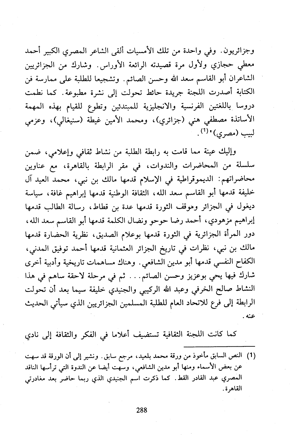 (1) النص السابق مأخوذ من ورقة محمد بلعيد، مرجع سابق، ونشير إلى أن الورقة قد سهت عن بعض الأسماء ومنها أبو مدين الشافعي، وسهت أيضا عن الندوة التي ترأسها الناقد المصري عبد القادر القط، كما ذكرت اسم الجنيدي الذي ربما حاضر بعد مغادرتي القاهرة.
