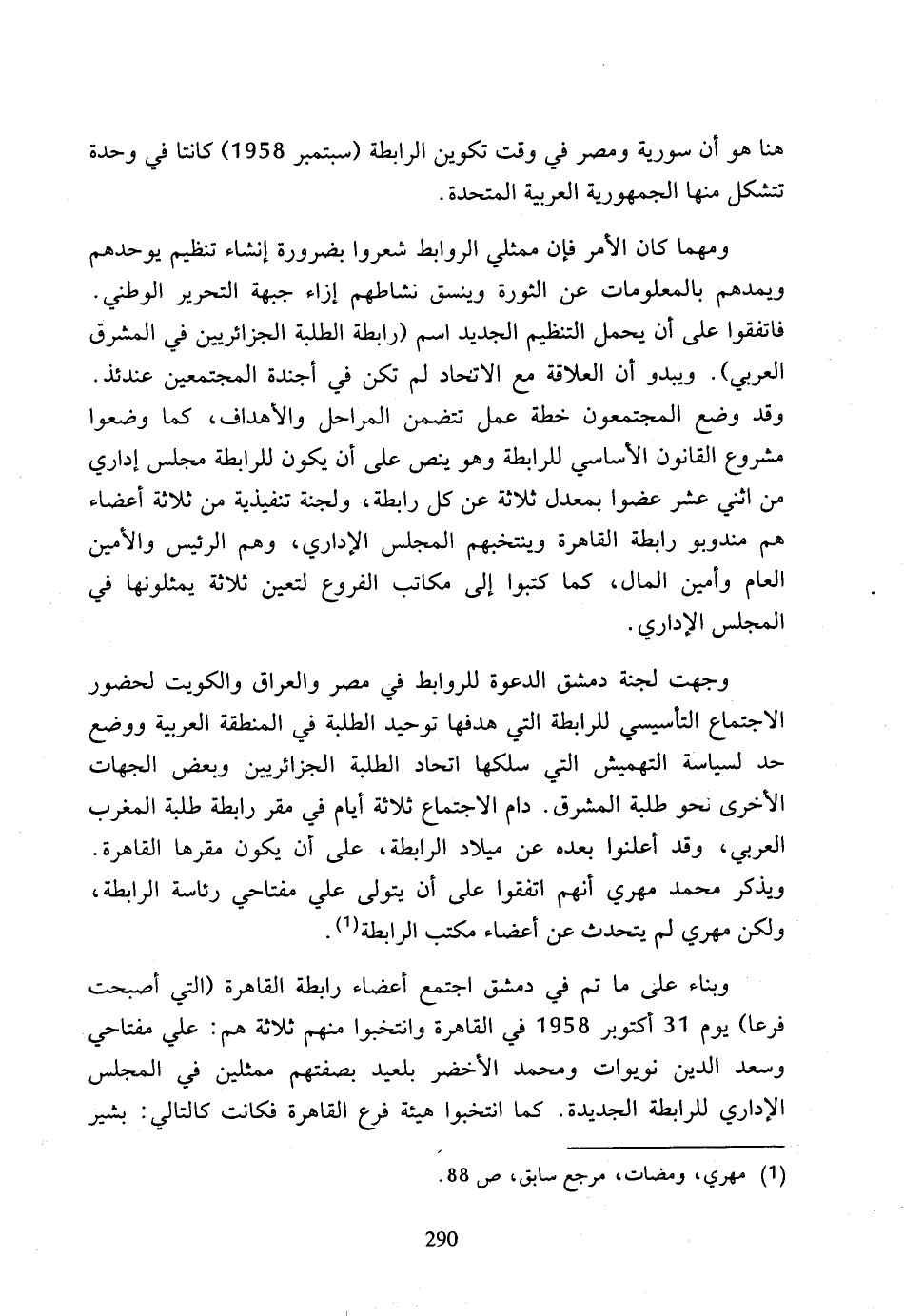 وبناء على ما تم في دمشق اجتمع أعضاء رابطة القاهرة (التي أصبحت فرعا) يوم 31 أكتوبر 1958 في القاهرة وانتخبوا منهم ثلاثة هم: علي مفتاحي، وسعد الدين نويوات ومحمد الأخضر بلعيد بصفتهم ممثلين في المجلس الإداري للرابطة الجديدة، كما انتخبوا هيئة فرع القاهرة فكانت كالتالي: بشير