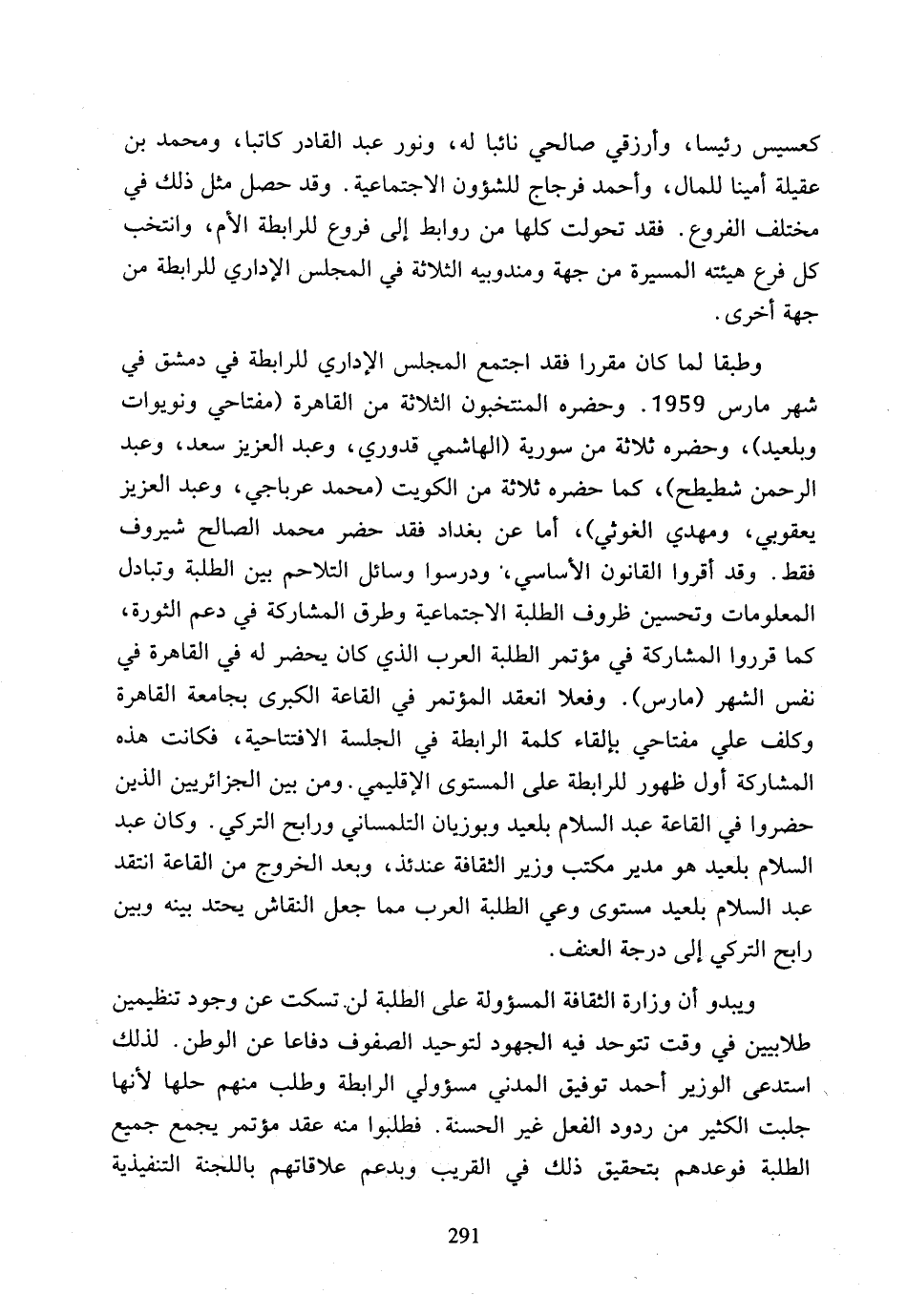 وطبقا لما كان مقررا فقد اجتمع المجلس الإداري للرابطة في دمشق في شهر مارس 1959، وحضره المنتخبون الثلاثة من القاهرة (مفتاحي ونويوات وبلعيد)، وحضره ثلاثة من سورية (الهاشمي قدوري، وعبد العزيز سعد، وعبد الرحمن شطيطح)، كما حضره ثلاثة من الكويت (محمد عرباجي، وعبد العزيز يعقوبي، ومهدي الغوثي)، أما عن بغداد فقد حضر محمد الصالح شيروف فقط، وقد أقروا القانون الأساسي، ودرسوا وسائل التلاحم بين الطلبة وتبادل المعلومات وتحسين ظروف الطلبة الاجتماعية وطرق المشاركة في دعم الثورة، كما قرروا المشاركة في مؤتمر الطلبة العرب الذي كان يحضر له في القاهرة في نفس الشهر (مارس)، وفعلا انعقد المؤتمر في القاعة الكبرى بجامعة القاهرة وكلف علي مفتاحي بإلقاء كلمة الرابطة في الجلسة الافتتاحية، فكانت هذه المشاركة أول ظهور للرابطة على المستوى الإقليمي، ومن بين الجزائريين الذين حضروا في القاعة عبد السلام بلعيد وبوزيان التلمساني ورابح التركي، وكان عبد السلام بلعيد هو مدير مكتب وزير الثقافة عندئذ، وبعد الخروج من القاعة انتقد عبد السلام بلعيد مستوى وعي الطلبة العرب مما جعل النقاش يحتد بينه وبين رابح التركي إلى درجة العنف.