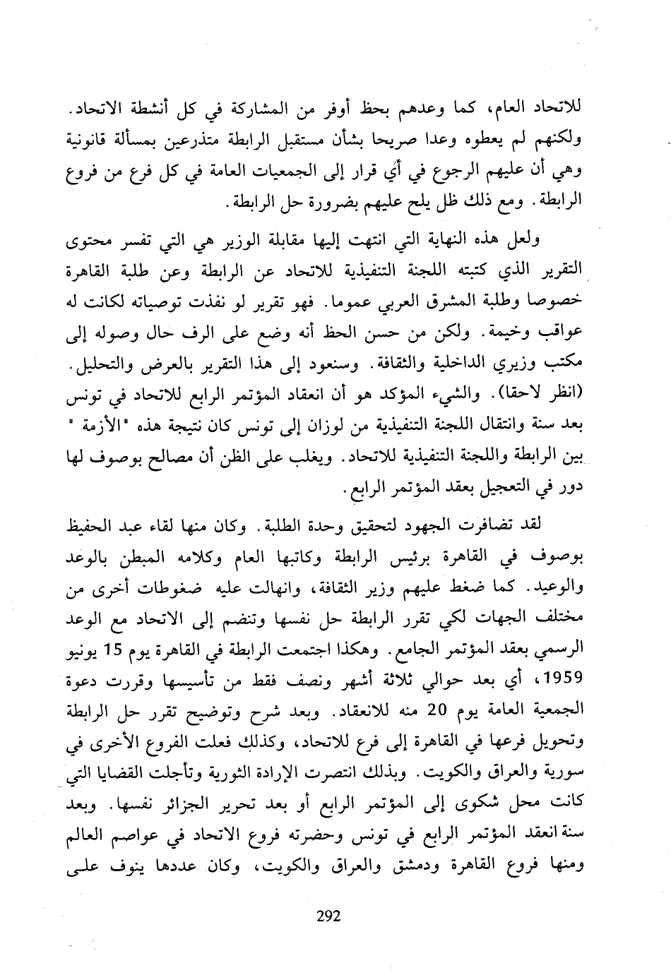 للاتحاد العام، كما وعدهم بحظ أوفر من المشاركة في كل أنشطة الاتحاد، ولكنهم لم يعطوه وعدا صريحا بشأن مستقبل الرابطة متذرعين بمسألة قانونية وهي أن عليهم الرجوع في أي قرار إلى الجمعيات العامة في كل فرع من فروع الرابطة، ومع ذلك ظل يلح عليهم بضرورة حل الرابطة.