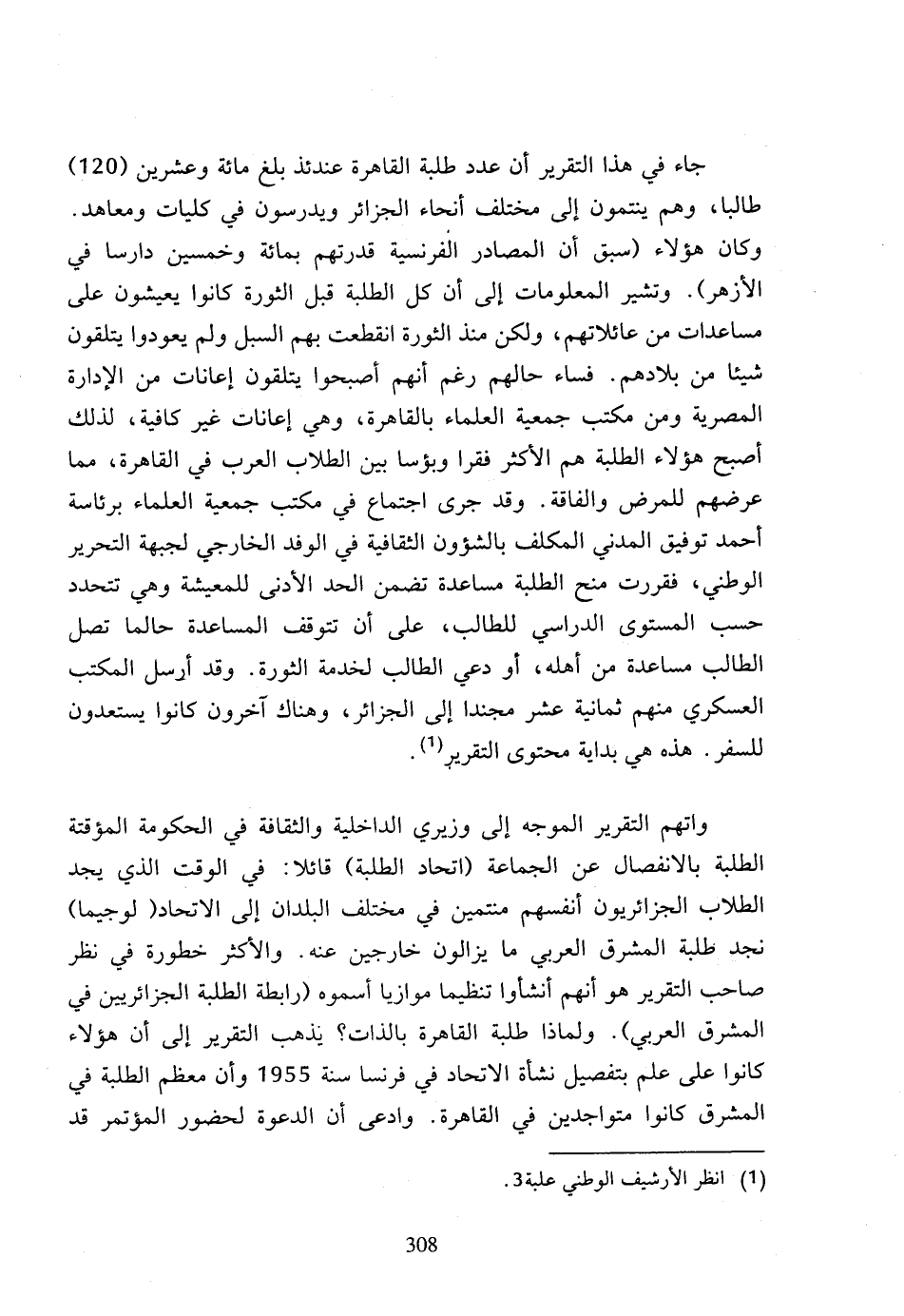 جاء في هذا التقرير أن عدد طلبة القاهرة عندئذ بلغ مائة وعشرين (120) طالبا، وهم ينتمون إلى مختلف أنحاء الجزائر ويدرسون في كليات ومعاهد، وكان هؤلاء (سبق أن المصادر الفرنسية قدرتهم بمائة وخمسين دارسا في الأزهر)، وتشير المعلومات إلى أن كل الطلبة قبل الثورة كانوا يعيشون على مساعدات من عائلاتهم، ولكن منذ الثورة انقطعت بهم السبل ولم يعودوا يتلقون شيئا من بلادهم، فساء حالهم رغم أنهم أصبحوا يتلقون إعانات من الإدارة المصرية ومن مكتب جمعية العلماء بالقاهرة، وهي إعانات غير كافية، لذلك أصبح هؤلاء الطلبة هم الأكثر فقرا وبؤسا بين الطلاب العرب في القاهرة، مما عرضهم للمرض والفاقة، وقد جرى اجتماع في مكتب جمعية العلماء برئاسة أحمد توفيق المدني المكلف بالشؤون الثقافية في الوفد الخارجي لجبهة التحرير الوطني، فقررت منح الطلبة مساعدة تضمن الحد الأدنى للمعيشة وهي تتحدد حسب المستوى الدراسي للطالب، على أن تتوقف المساعدة حالما تصل الطالب مساعدة من أهله، أو دعي الطالب لخدمة الثورة، وقد أرسل المكتب العسكري منهم ثمانية عشر مجندا إلى الجزائر، وهناك آخرون كانوا يستعدون للسفر، هذه هي بداية محتوى التقرير (1).