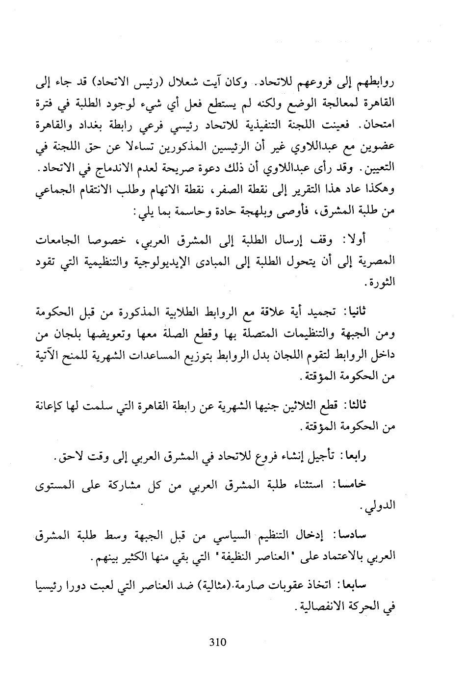 روابطهم إلى فروعهم للاتحاد، وكان آيت شعلال (رئيس الاتحاد,) قد جاء إلى القاهرة لمعالجة الوضع ولكنه لم يستطع فعل أي شيء لوجود الطلبة في فترة امتحان، فعينت اللجنة التنفيذية للاتحاد رئيسي فرعي رابطة بغداد والقاهرة عضوين مع عبد اللاوي غير أن الرئيسين المذكورين تساءلا عن حق اللجنة في التعيين، وقد رأى عبد اللاوي أن ذلك دعوة صريحة لعدم الاندماج في الاتحاد، وهكذا عاد هذا التقرير إلى نقطة الصفر، نقطة الاتهام وطلب الانتقام الجماعي من طلبة المشرق، فأوصى وبلهجة حادة وحاسمة بما يلي: