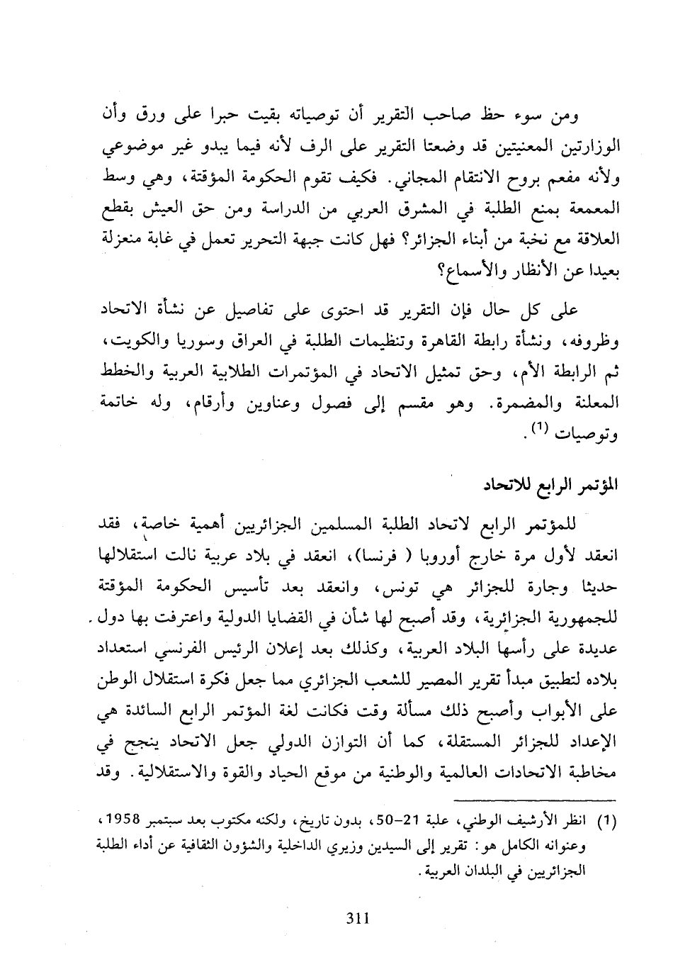 (1) انظر الأرشيف الوطني، علبة 21 - 50، بدون تاريخ، ولكنه مكتوب بعد سبتمبر 1958، وعنوانه الكامل هو: تقرير إلى السيدين وزيري الداخلية والشؤون الثقافية عن أداء الطلبة الجزائريين في البلدان العربية.