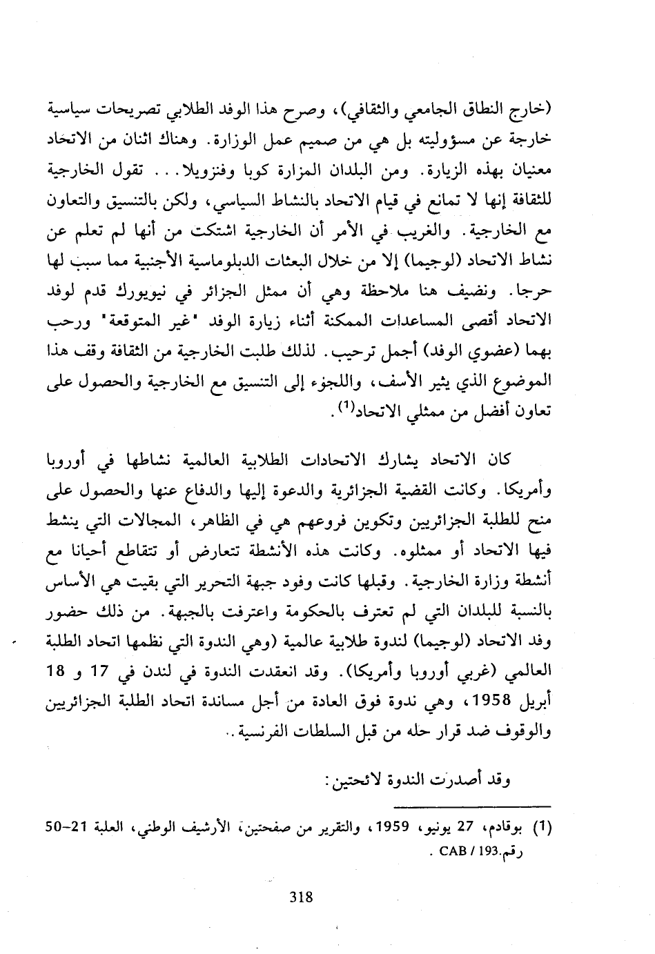 (خارج النطاق الجامعي والثقافي)، وصرح هذا الوفد الطلابي تصريحات سياسية خارجة عن مسؤوليته بل هي من صميم عمل الوزارة، وهناك اثنان من الاتحاد معنيان بهذه الزيارة، ومن البلدان المزارة كوبا وفنزويلا ... تقول الخارجية للثقافة إنها لا تمانع في قيام الاتحاد بالنشاط السياسي، ولكن بالتنسيق والتعاون مع الخارجية، والغريب في الأمر أن الخارجية اشتكت من أنها لم تعلم عن نشاط الاتحاد (لوجيما) إلا من خلال البعثات الدبلوماسية الأجنبية مما سبب لها حرجا، ونضيف هنا ملاحظة وهي أن ممثل الجزائر في نيويورك قدم لوفد الاتحاد أقصى المساعدات الممكنة أثناء زيارة الوفد (غير المتوقعة) ورحب بهما (عضوي الوفد) أجمل ترحيب، لذلك طلبت الخارجية من الثقافة وقف هذا الموضوع الذي يثير الأسف، واللجوء إلى التنسيق مع الخارجية والحصول على تعاون أفضل من ممثلي الاتحاد (1).