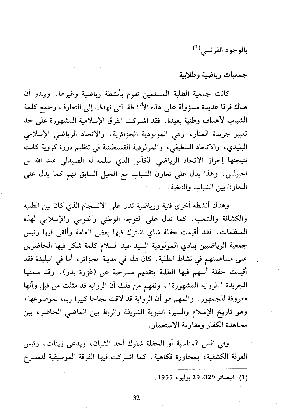 وهناك أنشطة أخرى فنية ورياضية تدل على الانسجام الذي كان بين الطلبة والكشافة والشعب، كما تدل على التوجه الوطني والقومي والإسلامي لهذه المنظمات، فقد أقيمت حفلة شاي اشترك فيها بعض العامة وألقى فيها رئيس جمعية الرياضيين بنادي المولودية السيد عبد السلام كلمة شكر فيها الحاضرين على مساهمتهم في نشاط الطلبة، كان هذا في مدينة الجزائر، أما في البليدة فقد أقيمت حفلة أسهم فيها الطلبة بتقديم مسرحية عن (غزوة بدر)، وقد سمتها الجريدة (الرواية المشهورة)، ونفهم من ذلك أن الرواية قد مثلت من قبل وأنها معروفة للجمهور، والمهم هو أن الرواية قد لاقت نجاحا كبيرا ربما لموضوعها، وهو تاريخ الإسلام والسيرة النبوية الشريفة والربط بين الماضي الحاضر، بين مجاهدة الكفار ومقاومة الاستعمار.
