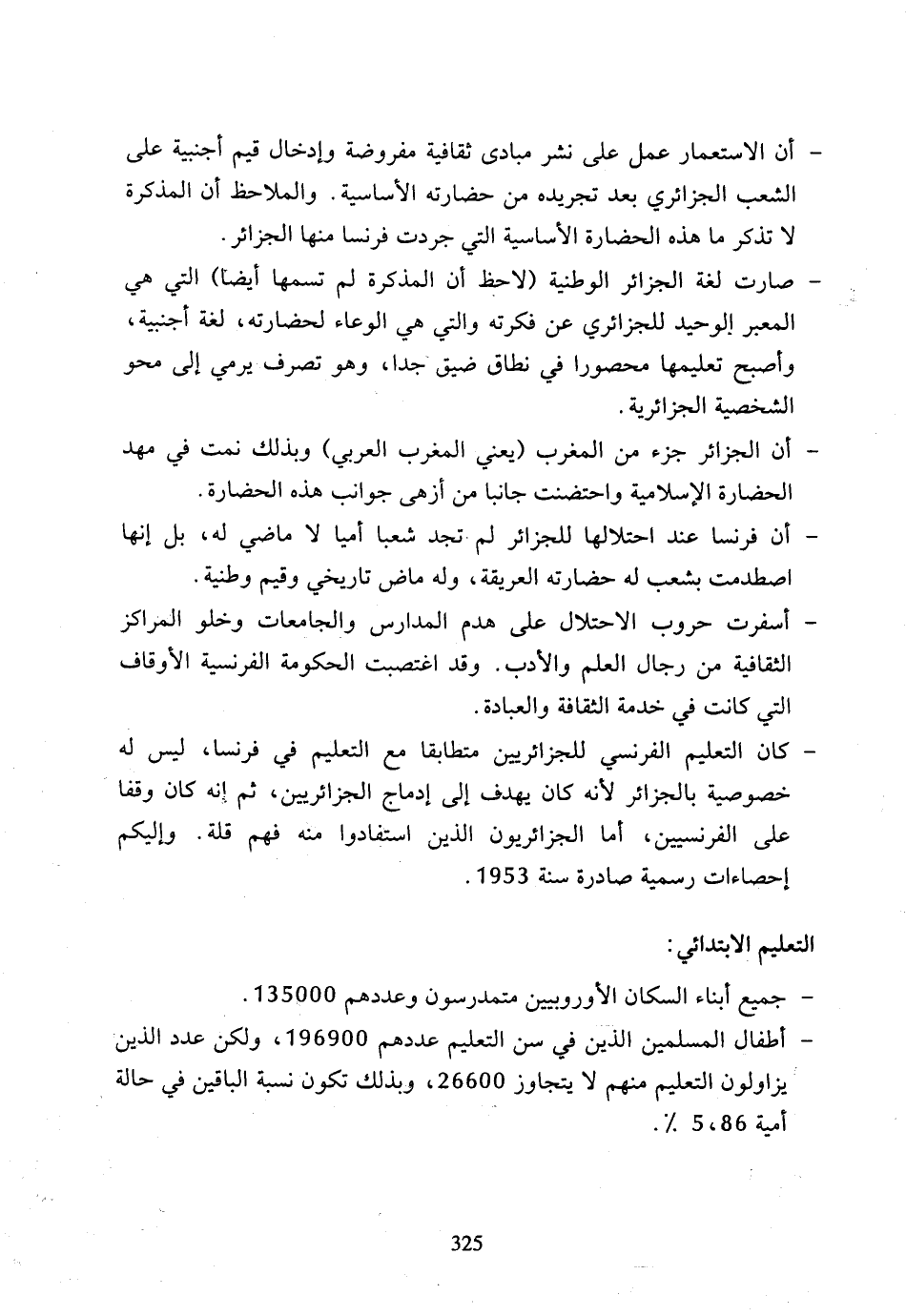 - أن الاستعمار عمل على نشر مبادى ثقافية مفروضة وإدخال قيم أجنبية على الشعب الجزائري بعد تجريده من حضارته الأساسية، والملاحظ أن المذكرة لا تذكر ما هذه الحضارة الأساسية التي جردت فرنسا منها الجزائر.