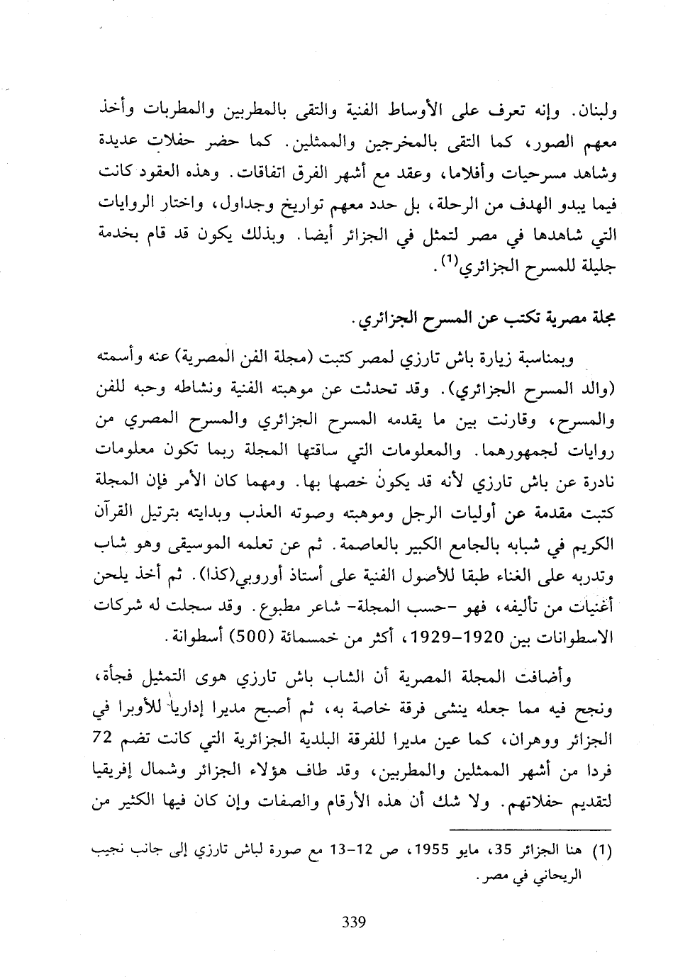 (1) هنا الجزائر 35، مايو 1955، ص 12 - 13 مع صورة لباش تارزي إلى جانب نجيب الريحاني في مصر.