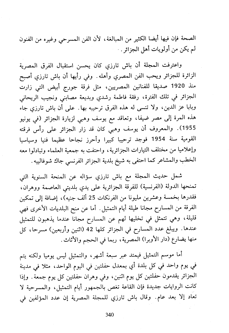 واعترفت المجلة أن باش تارزي كان يحسن استقبال الفرق المصرية الزائرة للجزائر ويحب الفن المصري وأهله، وفي رأيها أن باش تارزي أصبح منذ 1920 صديقا للفنانين المصريين، مثل فرقة جورج أبيض التي زارت الجزائر في تلك الفترة، رفقة فاطمة رشدي وبديعة مصابني ونجيب الريحاني وبابا عز الدين، ولا تنسى له هذه الفرق ترحيبه بها، على أن باش تارزي جاء هذه المرة إلى مصر ضيفا، وتعاقد مع يوسف وهبي لزيارة الجزائر (في يونيو 1955)، والمعروف أن يوسف وهبي كان قد زار الجزائر على رأس فرقته القومية سنة 1954 فوجد ترحيبا كبيرا وأحرز نجاحا عظيما فنيا وسياسيا وإعلاميا من مختلف التيارات الجزائرية، واحتفت به جمعية العلماء وتبادلوا معه الخطب والمشاعر كما احتفى به شيخ بلدية الجزائر الفرنسي جاك شوفالييه.