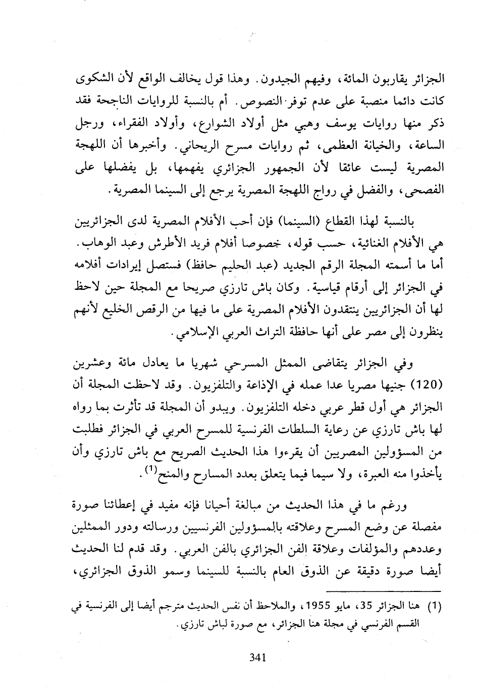 وفي الجزائر يتقاضى الممثل المسرحي شهريا ما يعادل مائة وعشرين (120) جنيها مصريا عدا عمله في الإذاعة والتلفزيون، وقد لاحظت المجلة أن الجزائر هي أول قطر عربي دخله التلفزيون، ويبدو أن المجلة قد تأثرت بما رواه لها باش تارزي عن رعاية السلطات الفرنسية للمسرح العربي في الجزائر فطلبت من المسؤولين المصريين أن يقرءوا هذا الحديث الصريح مع باش تارزي وأن يأخذوا منه العبرة، ولا سيما فيما يتعلق بعدد المسارح والمنح (1).