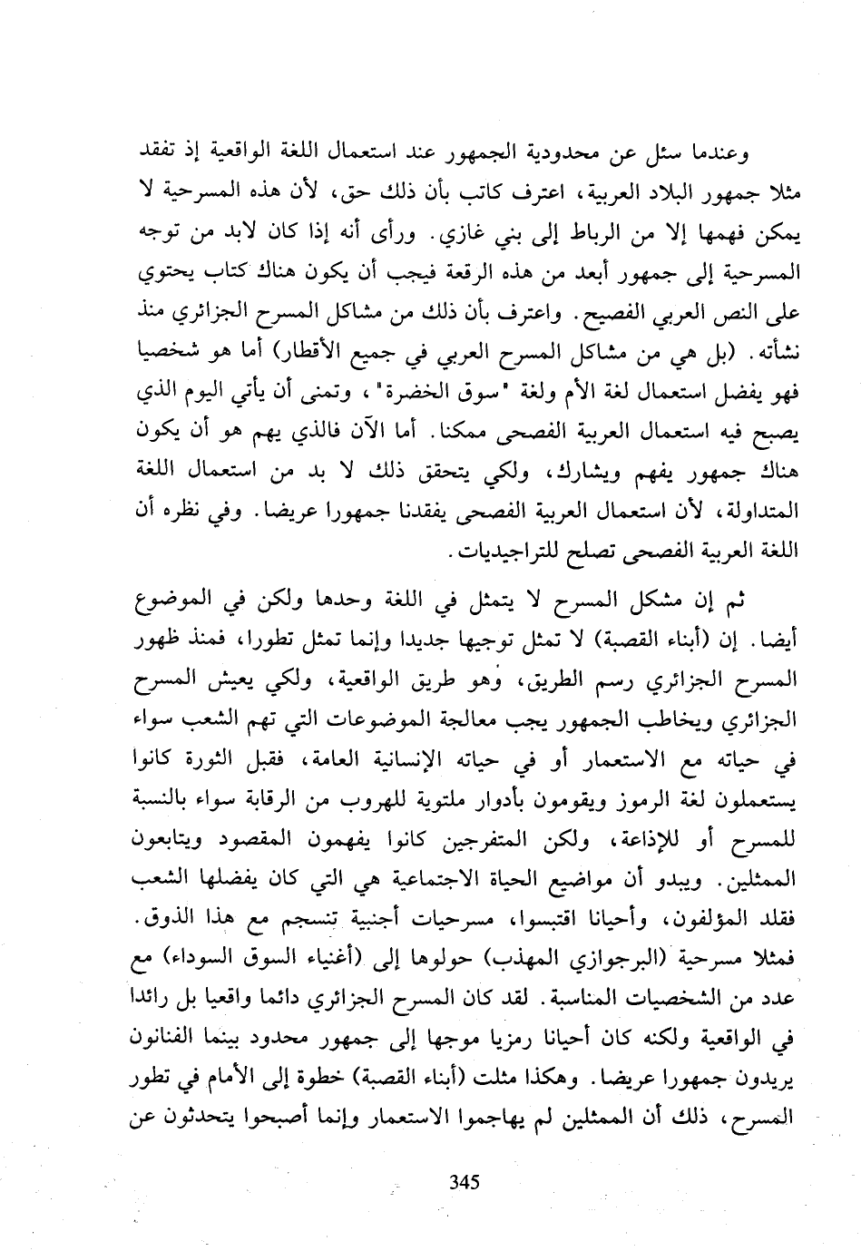 وعندما سئل عن محدودية الجمهور عند استعمال اللغة الواقعية إذ تفقد مثلا جمهور البلاد العربية، اعترف كاتب بأن ذلك حق، لأن هذه المسرحية لا يمكن فهمها إلا من الرباط إلى بني غازي، ورأى أنه إذا كان لابد من توجه المسرحية إلى جمهور أبعد من هذه الرقعة فيجب أن يكون هناك كتاب يحتوي على النص العربي الفصيح، واعترف بأن ذلك من مشاكل المسرح الجزائري منذ نشأته، (بل هي من مشاكل المسرح العربي في جميع الأقطار) أما هو شخصيا فهو يفضل استعمال لغة الأم ولغة (سوق الخضرة)، وتمنى أن يأتي اليوم الذي يصبح فيه استعمال العربية الفصحى ممكنا، أما الآن فالذي يهم هو أن يكون هناك جمهور يفهم ويشارك، ولكي يتحقق ذلك لا بد من استعمال اللغة المتداولة، لأن استعمال العربية الفصحى يفقدنا جمهورا عريضا، وفي نظره أن اللغة العربية الفصحى تصلح للتراجيديات.