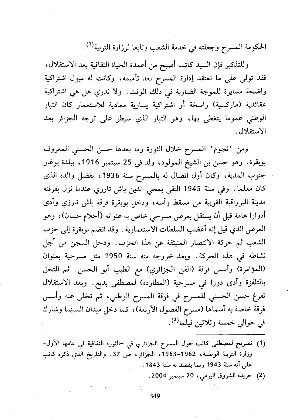 (1) تصريح لمصطفى كاتب حول المسرح الجزائري في - الثورة الثقافية في عامها الأول - وزارة التربية الوطنية، 1962 - 1963، الجزائر، ص 37، والتاريخ الذي ذكره كاتب على أنه سنة 1943 ربما يقصد به سنة 1843.