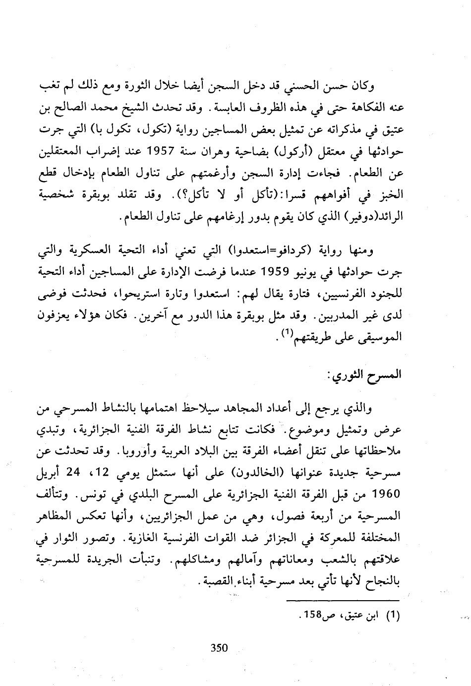 وكان حسن الحسني قد دخل السجن أيضا خلال الثورة ومع ذلك لم تغب عنه الفكاهة حتى في هذه الظروف العابسة، وقد تحدث الشيخ محمد الصالح بن عتيق في مذكراته عن تمثيل بعض المساجين رواية (تكول، تكول با) التي جرت حوادثها في معتقل (أركول) بضاحية وهران سنة 1957 عند إضراب المعتقلين عن الطعام، فجاءت إدارة السجن وأرغمتهم على تناول الطعام بإدخال قطع الخبز في أفواههم قسرا: (تأكل أو لا تأكل؟)، وقد تقلد بوبقرة شخصية الرائد (دوفير) الذي كان يقوم بدور إرغامهم على تناول الطعام.
