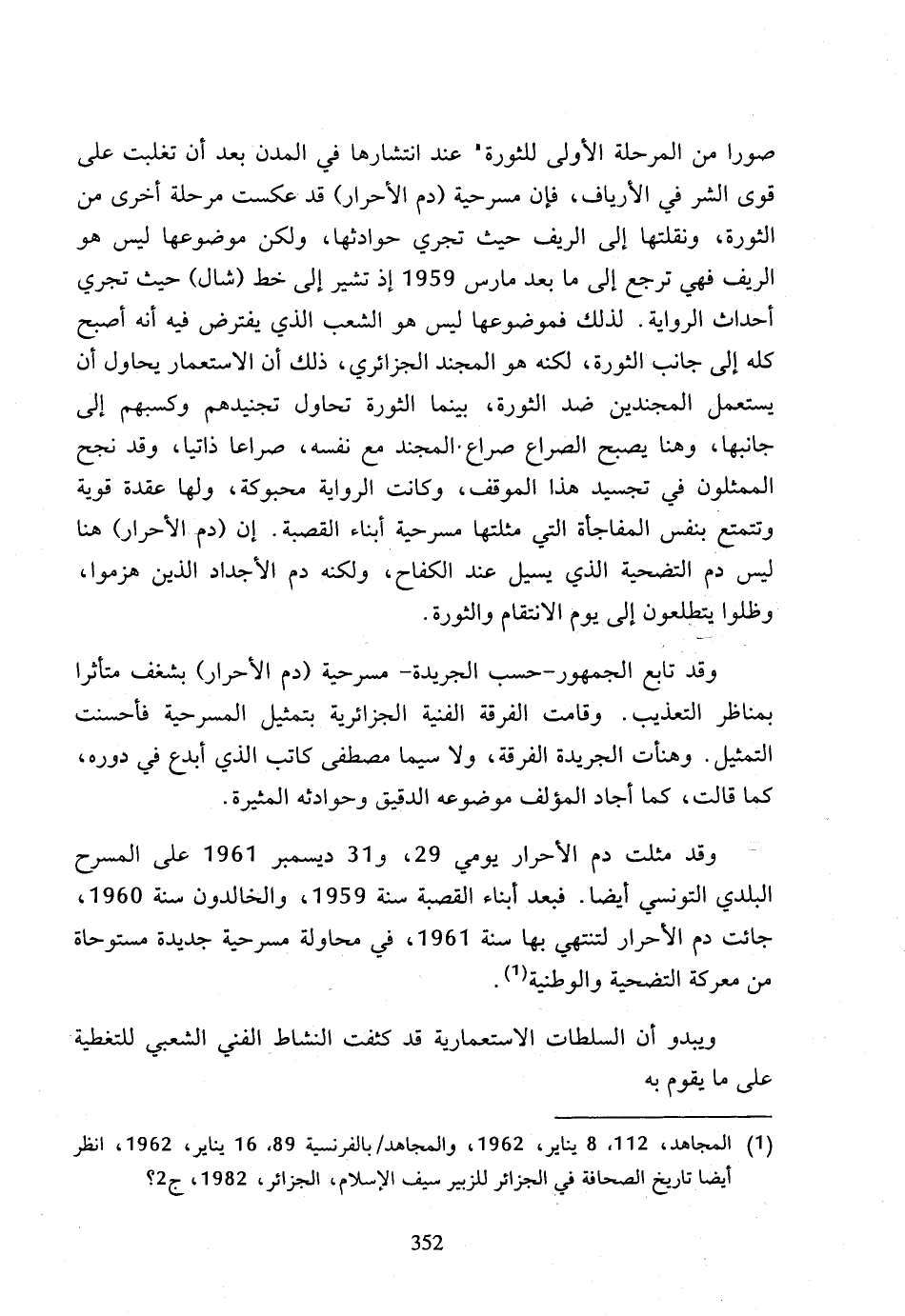 صورا من المرحلة الأولى للثورة) عند انتشارها في المدن بعد أن تغلبت على قوى الشر في الأرياف، فإن مسرحية (دم الأحرار) قد عكست مرحلة أخرى من الثورة، ونقلتها إلى الريف حيث تجري حوادثها، ولكن موضوعها ليس هو الريف فهي ترجع إلى ما بعد مارس 1959 إذ تشير إلى خط (شال) حيث تجري أحداث الرواية، لذلك فموضوعها ليس هو الشعب الذي يفترض فيه أنه أصبح كله إلى جانب الثورة، لكنه هو المجند الجزائري، ذلك أن الاستعمار يحاول أن يستعمل المجندين ضد الثورة، بينما الثورة تحاول تجنيدهم وكسبهم إلى جانبها، وهنا يصبح الصراع صراع المجند مع نفسه، صراعا ذاتيا، وقد نجح الممثلون في تجسيد هذا الموقف، وكانت الرواية محبوكة، ولها عقدة قوية وتتمتع بنفس المفاجأة التي مثلتها مسرحية أبناء القصبة، إن (دم الأحرار) هنا ليس دم التضحية الذي يسيل عند الكفاح، ولكنه دم الأجداد الذين هزموا، وظلوا يتطلعون إلى يوم الانتقام والثورة.