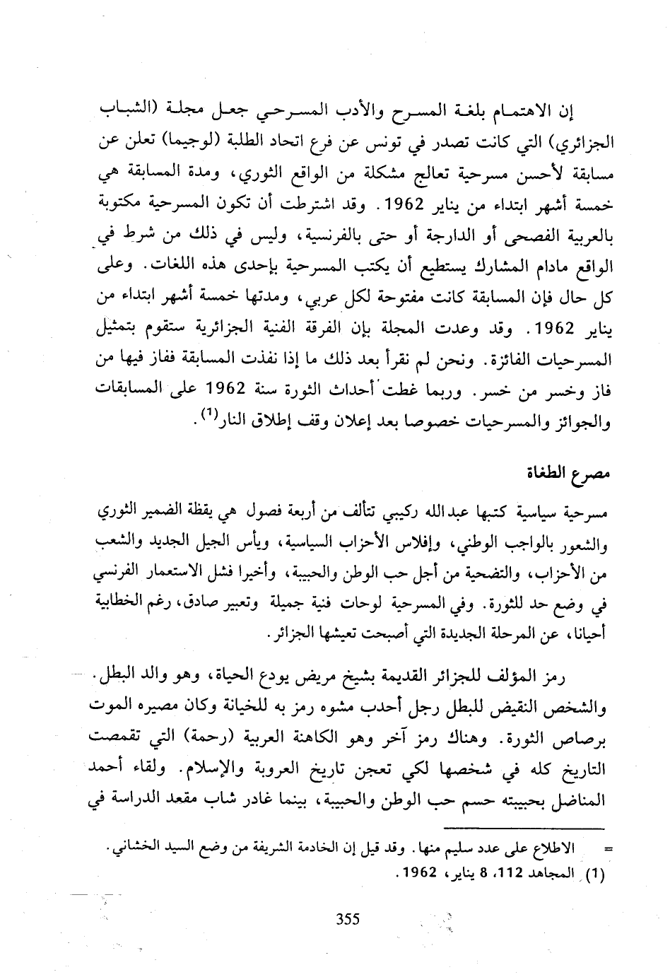 إن الاهتمام بلغة المسرح والأدب المسرحي جعل مجلة (الشباب الجزائري) التي كانت تصدر في تونس عن فرع اتحاد الطلبة (لوجيما) تعلن عن مسابقة لأحسن مسرحية تعالج مشكلة من الواقع الثوري، ومدة المسابقة هي خمسة أشهر ابتداء من يناير 1962، وقد اشترطت أن تكون المسرحية مكتوبة بالعربية الفصحى أو الدارجة أو حتى بالفرنسية، وليس في ذلك من شرط في الواقع ما دام المشارك يستطيع أن يكتب المسرحية بإحدى هذه اللغات، وعلى كل حال فإن المسابقة كانت مفتوحة لكل عربي، ومدتها خمسة أشهر ابتداء من يناير 1962، وقد وعدت المجلة بإن الفرقة الفنية الجزائرية ستقوم بتمثيل المسرحيات الفائزة، ونحن لم نقرأ بعد ذلك ما إذا نفذت المسابقة ففاز فيها من فاز وخسر من خسر، وربما غطت أحداث الثورة سنة 1962 على المسابقات والجوائز والمسرحيات خصوصا بعد إعلان وقف إطلاق النار (1).