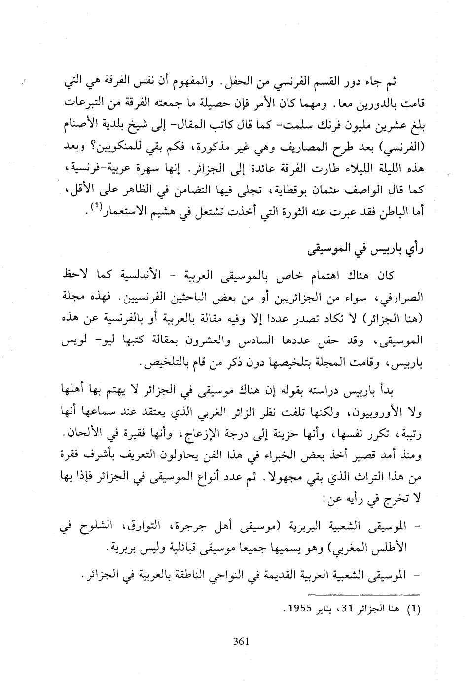 كان هناك اهتمام خاص بالموسيقى العربية - الأندلسية كما لاحظ الصرارفي، سواء من الجزائريين أو من بعض الباحثين الفرنسيين، فهذه مجلة (هنا الجزائر) لا تكاد تصدر عددا إلا وفيه مقالة بالعربية أو بالفرنسية عن هذه الموسيقى، وقد حفل عددها السادس والعشرون بمقالة كتبها ليو - لويس باربيس، وقامت المجلة بتلخيصها دون ذكر من قام بالتلخيص.