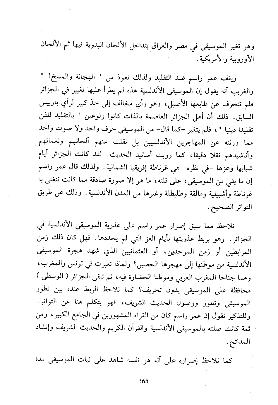 ويقف عمر راسم ضد التقليد ولذلك تعوذ من (الهجانة والمسخ!) والغريب أنه يقول إن الموسيقى الأندلسية هذه لم يطرأ عليها تغيير في الجزائر فلم تنحرف عن طابعها الأصيل، وهو رأي مخالف إلى حد كبير لرأي باربيس السابق، ذلك أن أهل الجزائر العاصمة بالذات كانوا ولوعين (بالتقليد للفن تقليدا دينيا)، فلم يتغير - كما قال - من الموسيقى حرف واحد ولا صوت واحد مما ورثته عن المهاجرين الأندلسيين بل نقلت عنهم ألحانهم ونغماتهم وأناشيدهم نقلا دقيقا، كما رويت أسانيد الحديث، لقد كانت الجزائر أيام شبابها وعزها - في نظره - هي غرناطة إفريقيا الشمالية، ولذلك قال عمر راسم إن ما بقي من الموسيقى، على قلته، ما هو إلا صورة صادقة مما كانت تتغنى به غرناطة وأشبيلية ومالقة وطليطلة وغيرها من المدن الأندلسية، وذلك عن طريق التواتر الصحيح.