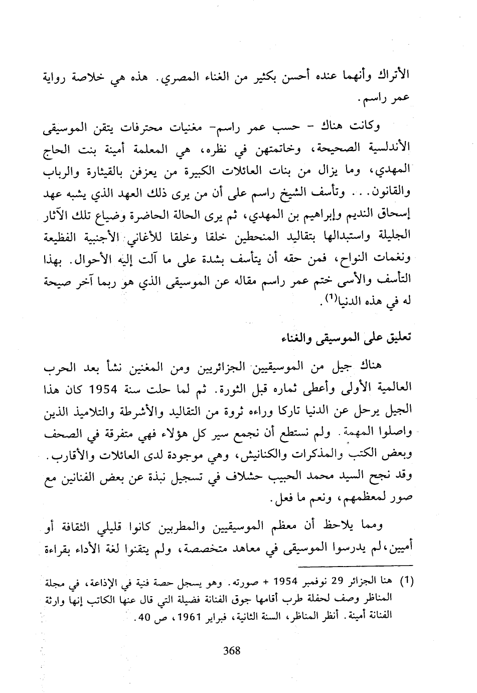 (1) هنا الجزائر 29 نوفمبر 1954 + صورته، وهو يسجل حصة فنية في الإذاعة، في مجلة المناظر وصف لحفلة طرب أقامها جوق الفنانة فضيلة التي قال عنها الكاتب إنها وارثة الفنانة أمينة، أنظر المناظر، السنة الثانية، فبراير 1961، ص 40.