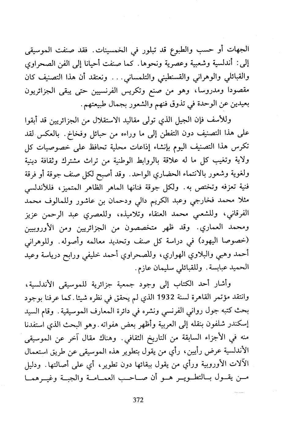 وأشار أحد الكتاب إلى وجود جمعية جزائرية للموسيقى الأندلسية. وانتقد مؤتمر القاهرة لسنة 1932 الذي لم يحقق في نظره شيئا، كما عرفنا بوجود بحث كتبه جول رواني الفرنسي ونشره في دائرة المعارف الموسيقية، وقام السيد إسكندر شلفون بنقله إلى العربية وأظهر بعض هفواته، وهو البحث الذي استفدنا منه في الأجزاء السابقة من التاريخ الثقافي، وهناك مقال آخر عن الموسيقى الأندلسية عرض رأيين، رأي من يقول بتطوير هذه الموسيقى عن طريق استعمال الآلات الأوروبية ورأي من يقول ببقائها دون تطوير، أي على أصالتها، ودليل من يقول بالتطوير هو أن صاحب العمامة والجبة وغيرهما