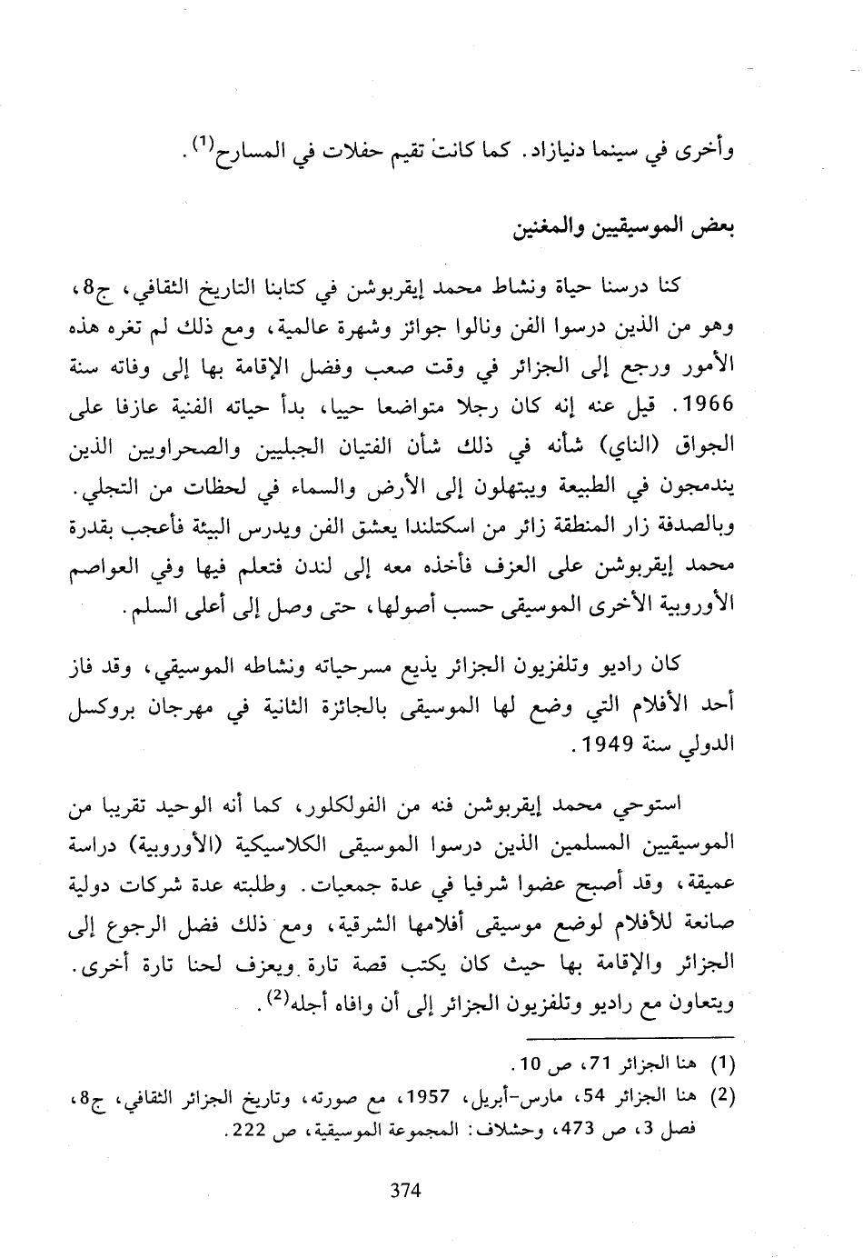 كنا درسنا حياة ونشاط محمد إيقربوشن في كتابنا التاريخ الثقافي، ج 8. وهو من الذين درسوا الفن ونالوا جوائز وشهرة عالمية، ومع ذلك لم تغره هذه الأمور ورجع إلى الجزائر في وقت صعب وفضل الإقامة بها إلى وفاته سنة 1966، قيل عنه إنه كان رجلا متواضعا حييا، بدأ حياته الفنية عازفا على الجواق (الناي) شأنه في ذلك شأن الفتيان الجبليين والصحراويين الذين يندمجون في الطبيعة ويبتهلون إلى الأرض والسماء في لحظات من التجلي، وبالصدفة زار المنطقة زائر من اسكتلندا يعشق الفن ويدرس البيئة فأعجب بقدرة محمد إيقربوشن على العزف فأخذه معه إلى لندن فتعلم فيها وفي العواصم الأوروبية الأخرى الموسيقى حسب أصولها، حتى وصل إلى أعلى السلم.