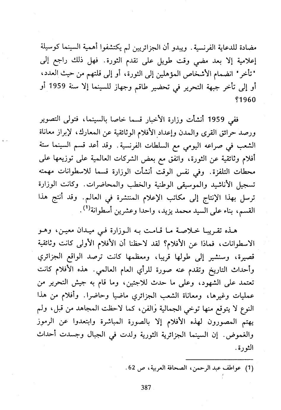 هذه تقريبا خلاصة ما قامت به الوزارة في ميدان معين، وهو الاسطوانات، فماذا عن الأفلام؟ لقد لاحظنا أن الأفلام الأولى كانت وثائقية قصيرة، وسنشير إلى طولها قريبا، ومعظمها كانت ترصد الواقع الجزائري وأحداث التاريخ وتقدم عنه صورة للرأي العام العالمي، هذه الأفلام كانت تعتمد على الشهود، وعلى ما حدث للاجئين، وما قام به جيش التحرير من عمليات وغيرها، ومعاناة الشعب الجزائري ماضيا وحاضرا، وأفلام من هذا النوع لا يتوقع منها توخي الجمالية والفن، كما لاحظت المجاهد من قبل، ولم يهتم المصورون لهذه الأفلام إلا بالصورة المباشرة وابتعدوا عن الرموز والغموض، إن السينما الجزائرية الثورية ولدت في الجبال وجسدت أحداث الثورة.