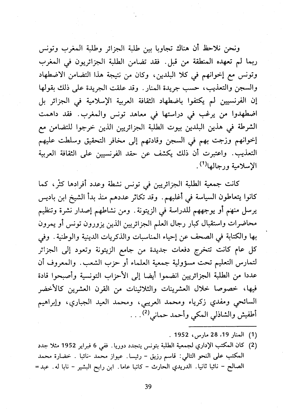 كانت جمعية الطلبة الجزائريين في تونس نشطة وعدد أفرادها كثر، كما كانوا يتعاطون السياسة في أغلبهم، وقد تكاثر عددهم منذ بدأ الشيخ ابن باديس يرسل منهم أو يوجههم للدراسة في الزيتونة، ومن نشاطهم إصدار نشرة وتنظيم محاضرات واستقبال كبار رجال العلم الجزائريين الذين يزورون تونس أو يمرون بها والكتابة في الصحف عن إحياء المناسبات والذكريات الدينية والوطنية، وفي كل عام كانت تتخرج دفعات جديدة من جامع الزيتونة وتعود إلى الجزائر لتمارس التعليم تحت مسؤولية جمعية العلماء أو حزب الشعب، والمعروف أن عددا من الطلبة الجزائريين انضموا أيضا إلى الأحزاب التونسية وأصبحوا قادة فيها، خصوصا خلال العشرينات والثلاثينات من القرن العشرين كالأخضر السائحي ومفدي زكرياء ومحمد العريبي، ومحمد العيد الجباري، وإبراهيم أطفيش والشاذلي المكي وأحمد حماني (2) ...