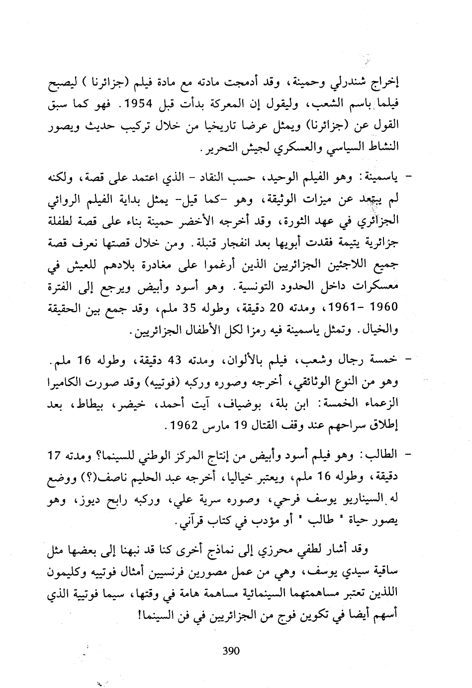 - ياسمينة: وهو الفيلم الوحيد، حسب النقاد - الذي اعتمد على قصة، ولكنه لم يبتعد عن ميزات الوثيقة، وهو - كما قيل - يمثل بداية الفيلم الروائي الجزائري في عهد الثورة، وقد أخرجه الأخضر حمينة بناء على قصة لطفلة جزائرية يتيمة فقدت أبويها بعد انفجار قنبلة، ومن خلال قصتها نعرف قصة جميع اللاجئين الجزائريين الذين أرغموا على مغادرة بلادهم للعيش في معسكرات داخل الحدود التونسية، وهو أسود وأبيض ويرجع إلى الفترة 1960 - 1961، ومدته 20 دقيقة، وطوله 35 ملم، وقد جمع بين الحقيقة والخيال، وتمثل ياسمينة فيه رمزا لكل الأطفال الجزائريين.