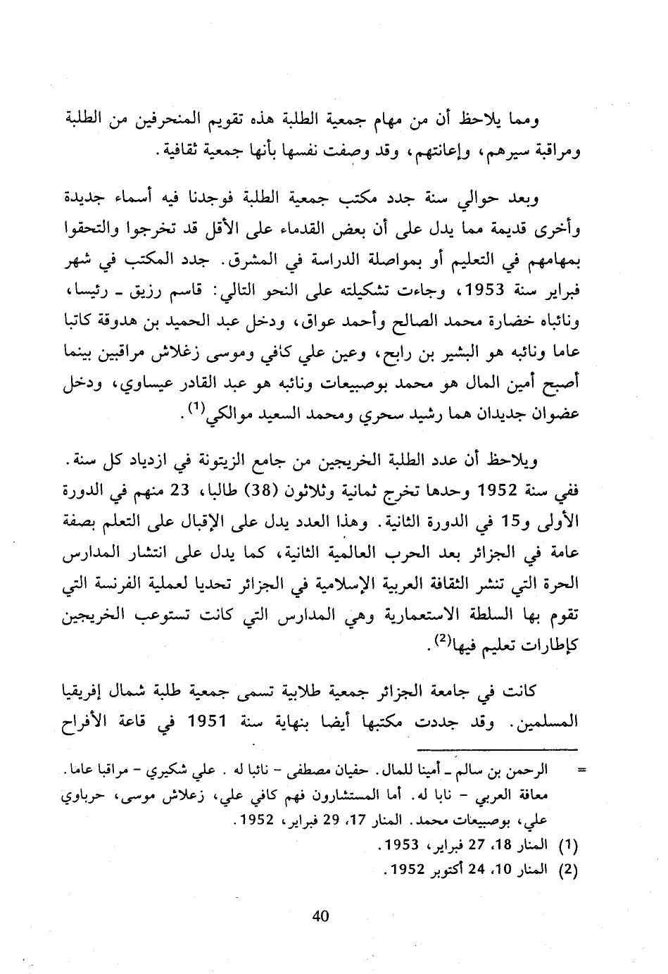 وبعد حوالي سنة جدد مكتب جمعية الطلبة فوجدنا فيه أسماء جديدة وأخرى قديمة مما يدل على أن بعض القدماء على الأقل قد تخرجوا والتحقوا بمهامهم في التعليم أو بمواصلة الدراسة في المشرق، جدد المكتب في شهر فبراير سنة 1953، وجاءت تشكيلته على النحو التالي: قاسم رزيق - رئيسا، ونائباه خضارة محمد الصالح وأحمد عواق، ودخل عبد الحميد بن هدوقة كاتبا عاما ونائبه هو البشير بن رابح، وعين علي كافي وموسى زغلاش مراقبين بينما أصبح أمين المال هو محمد بوصبيعات ونائبه هو عبد القادر عيساوي، ودخل عضوان جديدان هما رشيد سحري ومحمد السعيد موالكي (1).