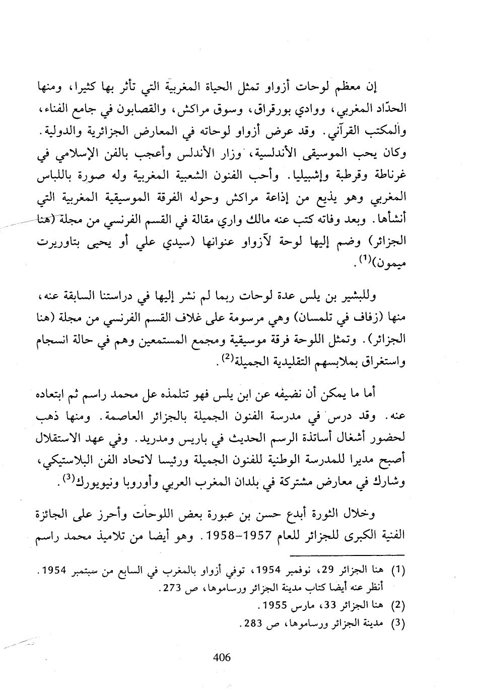 (1) هنا الجزائر 29، نوفمبر 1954، توفي أزوار بالمغرب في السابع من سبتمبر 1954، انظر عنه أيضا كتاب مدينة الجزائر ورساموها، ص 273.