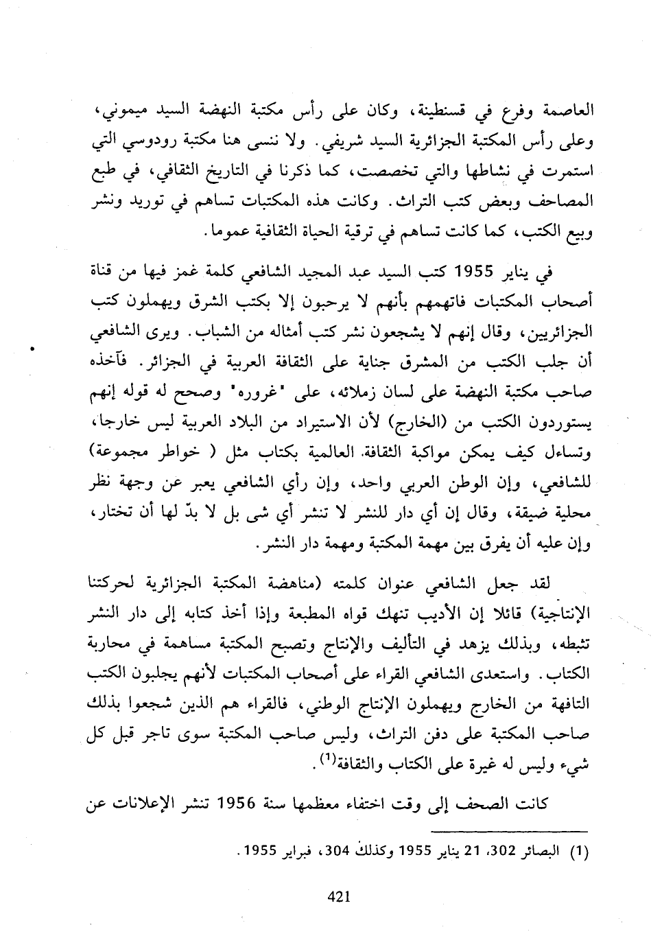 العاصمة وفرع في قسنطينة، وكان على رأس مكتبة النهضة السيد ميموني، وعلى رأس المكتبة الجزائرية السيد شريفي، ولا ننسى هنا مكتبة رودوسي التي استمرت في نشاطها والتي تخصصت، كما ذكرنا في التاريخ الثقافي، في طبع المصاحف وبعض كتب التراث، وكانت هذه المكتبات تساهم في توريد ونشر وبيع الكتب، كما كانت تساهم في ترقية الحياة الثقافية عموما.