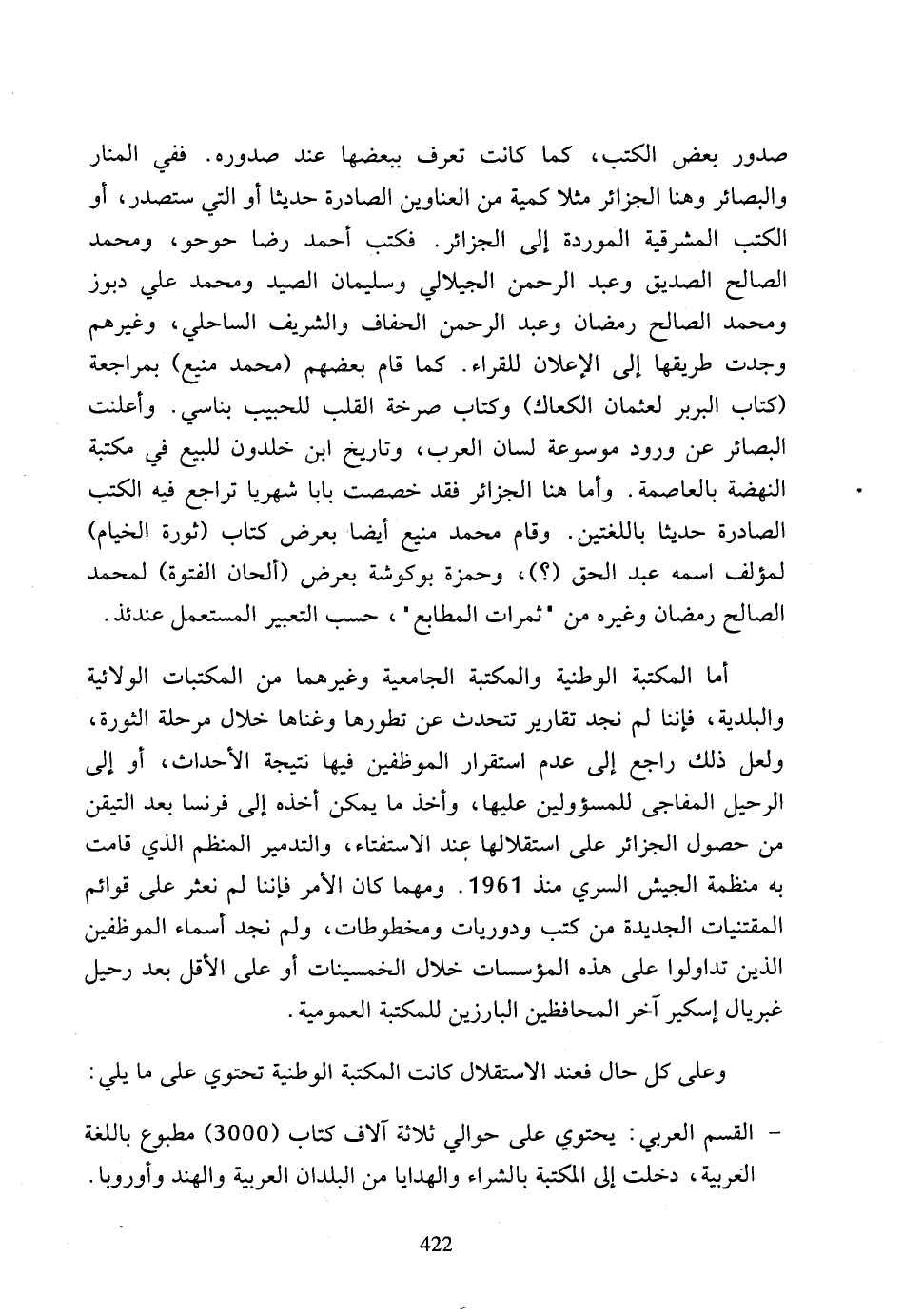 أما المكتبة الوطنية والمكتبة الجامعية وغيرهما من المكتبات الولائية والبلدية، فإننا لم نجد تقارير تتحدث عن تطورها وغناها خلال مرحلة الثورة، ولعل ذلك راجع إلى عدم استقرار الموظفين فيها نتيجة الأحداث، أو إلى الرحيل المفاجى للمسؤولين عليها، وأخذ ما يمكن أخذه إلى فرنسا بعد التيقن من حصول الجزائر على استقلالها عند الاستفتاء، والتدمير المنظم الذي قامت به منظمة الجيش السري منذ 1961، ومهما كان الأمر فإننا لم نعثر على قوائم المقتنيات الجديدة من كتب ودوريات ومخطوطات، ولم نجد أسماء الموظفين الذين تداولوا على هذه المؤسسات خلال الخمسينات أو على الأقل بعد رحيل غبريال إسكير آخر المحافظين البارزين للمكتبة العمومية.
