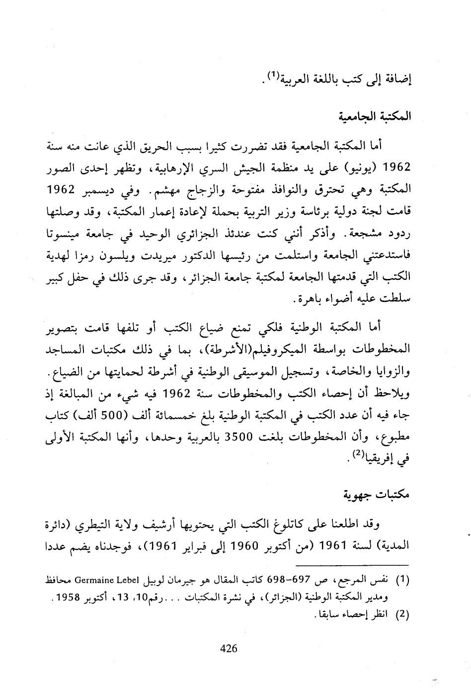 (1) نفس المرجع، ص 697 - 698 كاتب المقال هو جيرمان لوبيل Germaine Lebel محافظ ومدير المكتبة الوطنية (الجزائر)، في نشرة المكتبات ... رقم 10، 13، أكتوبر 1958.