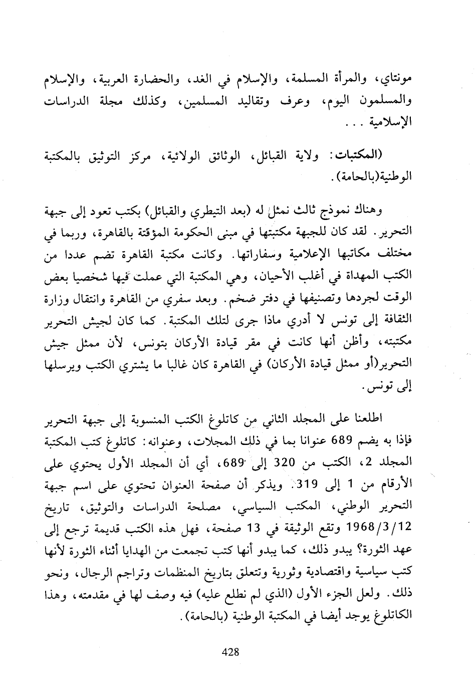 وهناك نموذج ثالث نمثل له (بعد التيطري والقبائل) بكتب تعود إلى جبهة التحرير، لقد كان للجبهة مكتبتها في مبنى الحكومة المؤقة بالقاهرة، وربما في مختلف مكاتبها الإعلامية وسفاراتها، وكانت مكتبة القاهرة تضم عددا من الكتب المهداة في أغلب الأحيان، وهي المكتبة التي عملت فيها شخصيا بعض الوقت لجردها وتصنيفها في دفتر ضخم، وبعد سفري من القاهرة وانتقال وزارة الثقافة إلى تونس لا أدري ماذا جرى لتلك المكتبة، كما كان لجيش التحرير مكتبته، وأظن أنها كانت في مقر قيادة الأركان يتونس، لأن ممثل جيش التجرير (أو ممثل قيادة الأركان) في القاهرة كان غالبا ما يشتري الكتب ويرسلها إلى تونس.